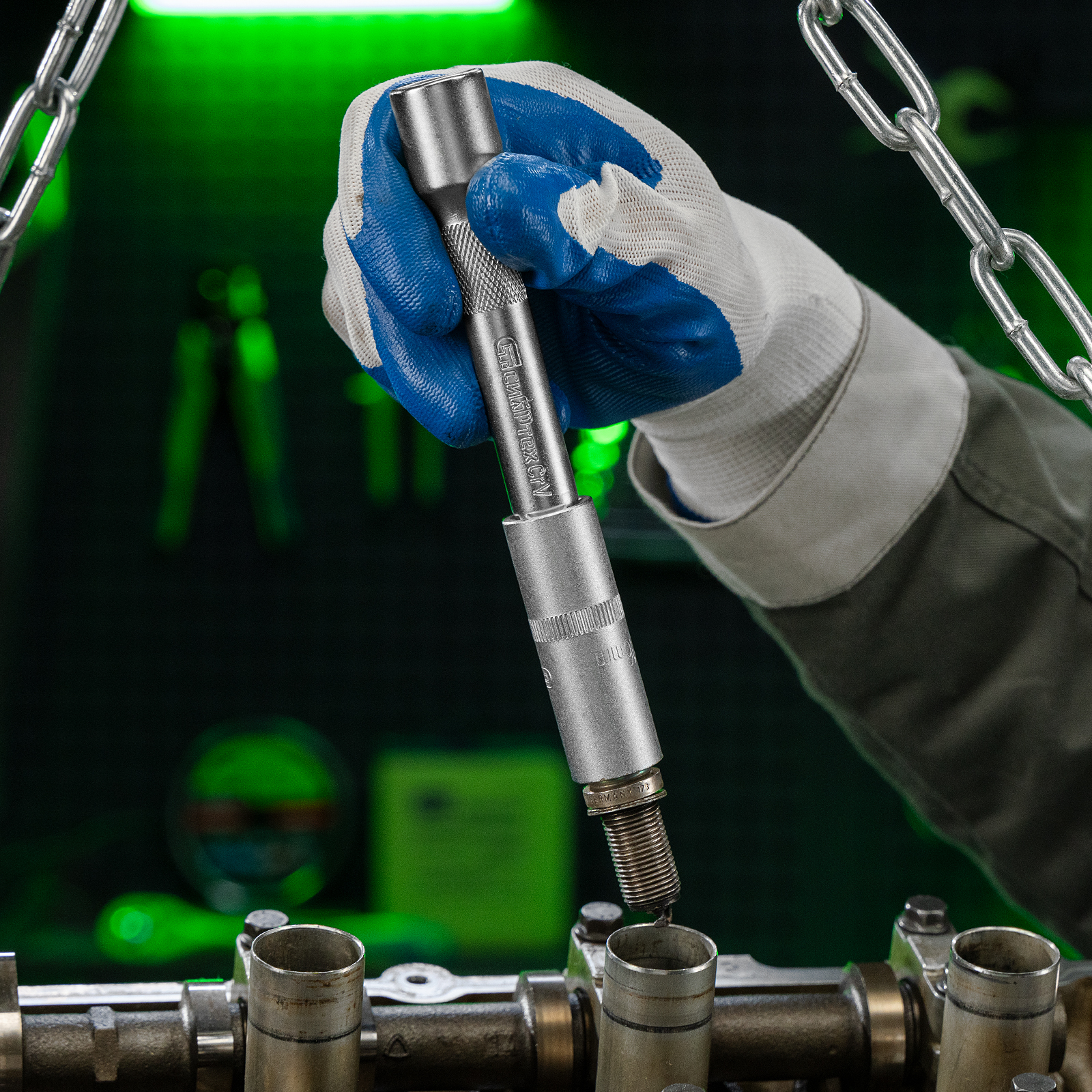 - Прочная фиксация — шариковый замок на трещотках, воротках, шарнирах и удлинителях надежно удерживает головки.