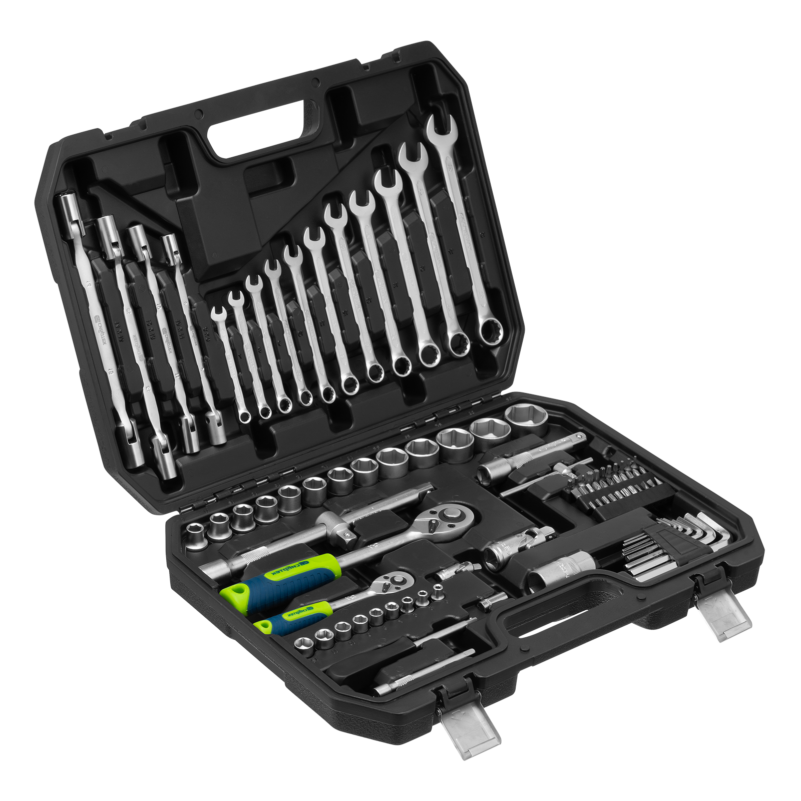 Набор инструментов Сибртех 13396 упакован в пластиковый кейс и состоит из 89 предметов с присоединительным размером 1/2" и 1/4", предназначенных для монтажа и демонтажа резьбового крепежа с разными типами шлицев. В комплект поставки входят карданы, удлинители и шарнирные ключи, облегчающие работу в труднодоступных местах. Набор используется для ремонта автомобилей, а также полезен в быту.