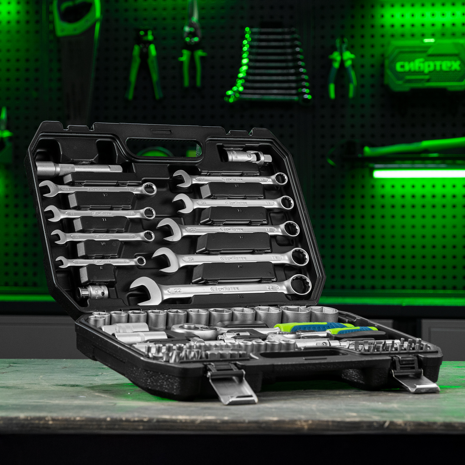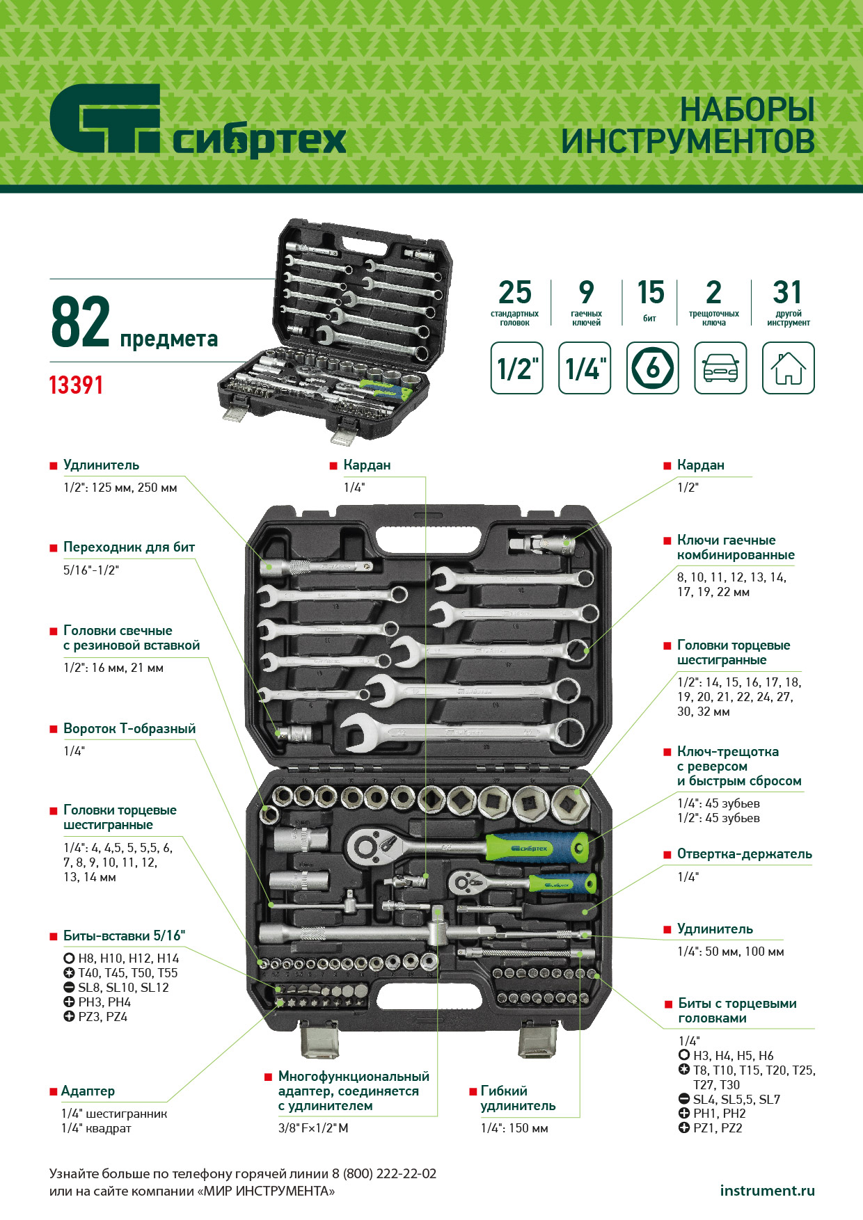 Набор инструментов Сибртех 13391 упакован в пластиковый кейс и состоит из 82 предметов с присоединительным размером 1/2" и 1/4", предназначенных для слесарных работ, преимущественно монтажа и демонтажа резьбового крепежа с разными типами шлицев. В комплект поставки входят карданы, удлинители и переходники, облегчающие работу в труднодоступных местах. Набор используется для ремонта автомобилей, а также полезен в быту.