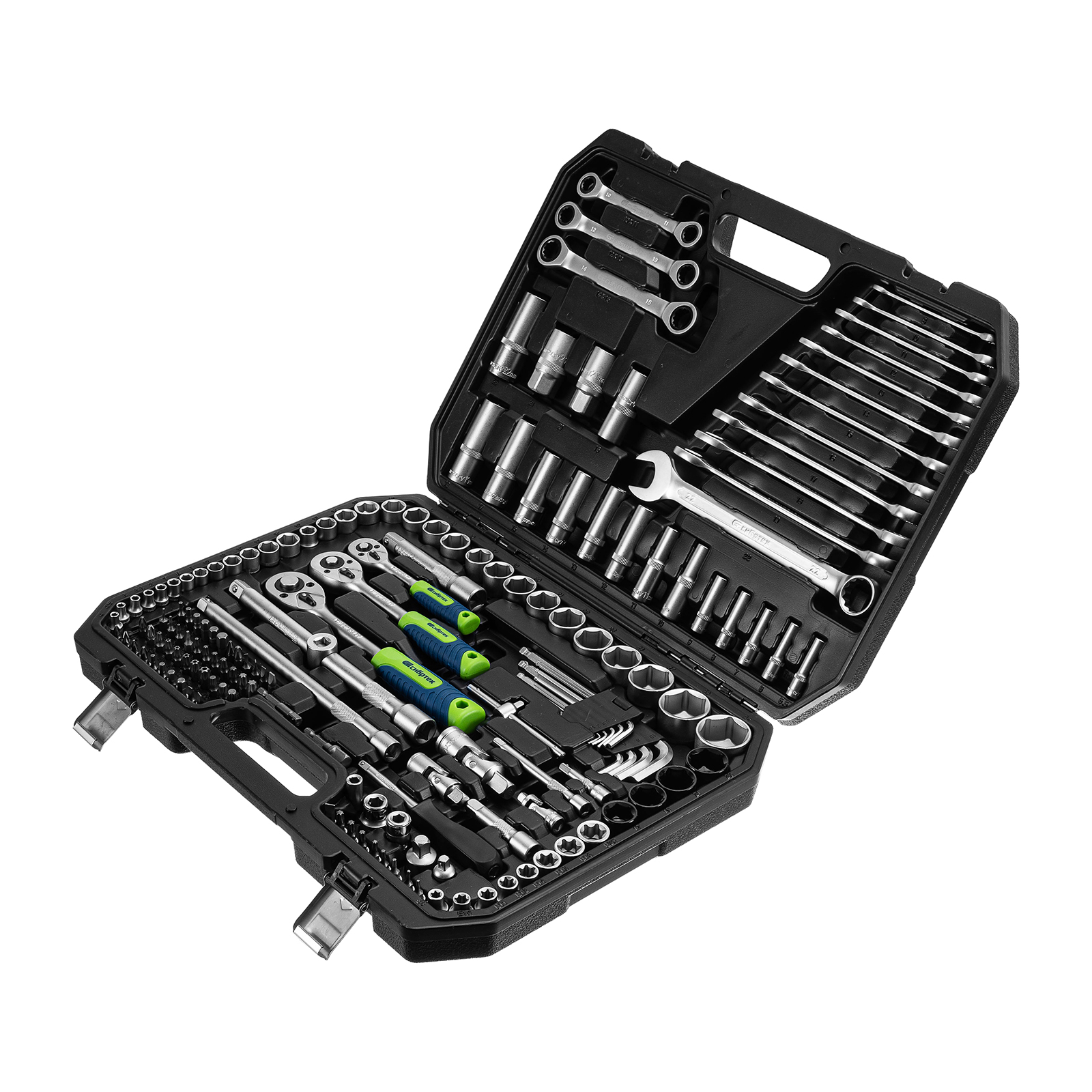 Набор инструментов Сибртех 14172 упакован в пластиковый кейс и состоит из 160 предметов с присоединительным размером 1/2", 3/8", 1/4", предназначенных для монтажа и демонтажа резьбового крепежа с разными типами шлицев. В комплект поставки входят карданы, удлинители и переходники, облегчающие работу в труднодоступных местах. Набор используется для ремонта автомобилей, а также будет полезен в быту.