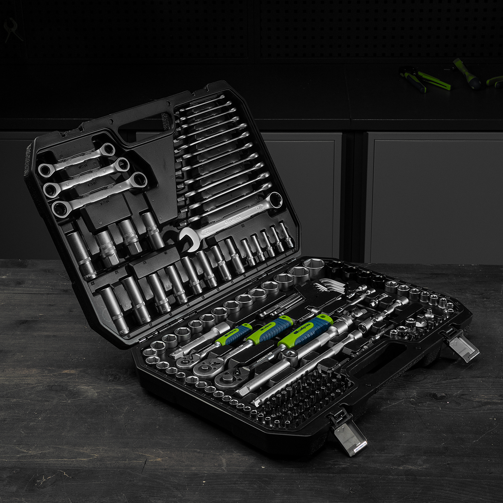 - Удобное хранение и транспортировка — инструменты и насадки упакованы в ударопрочный пластиковый кейс с металлическими замками.