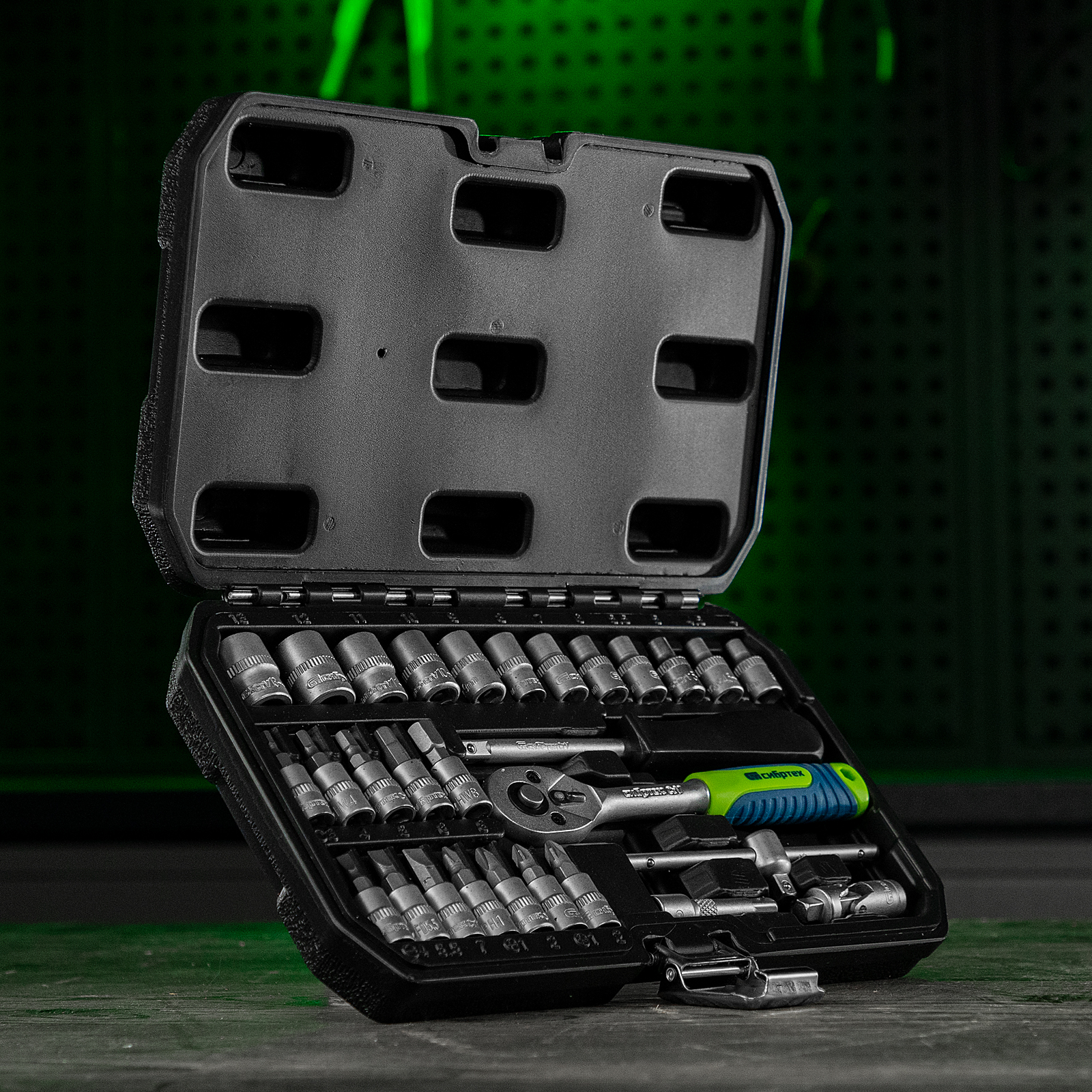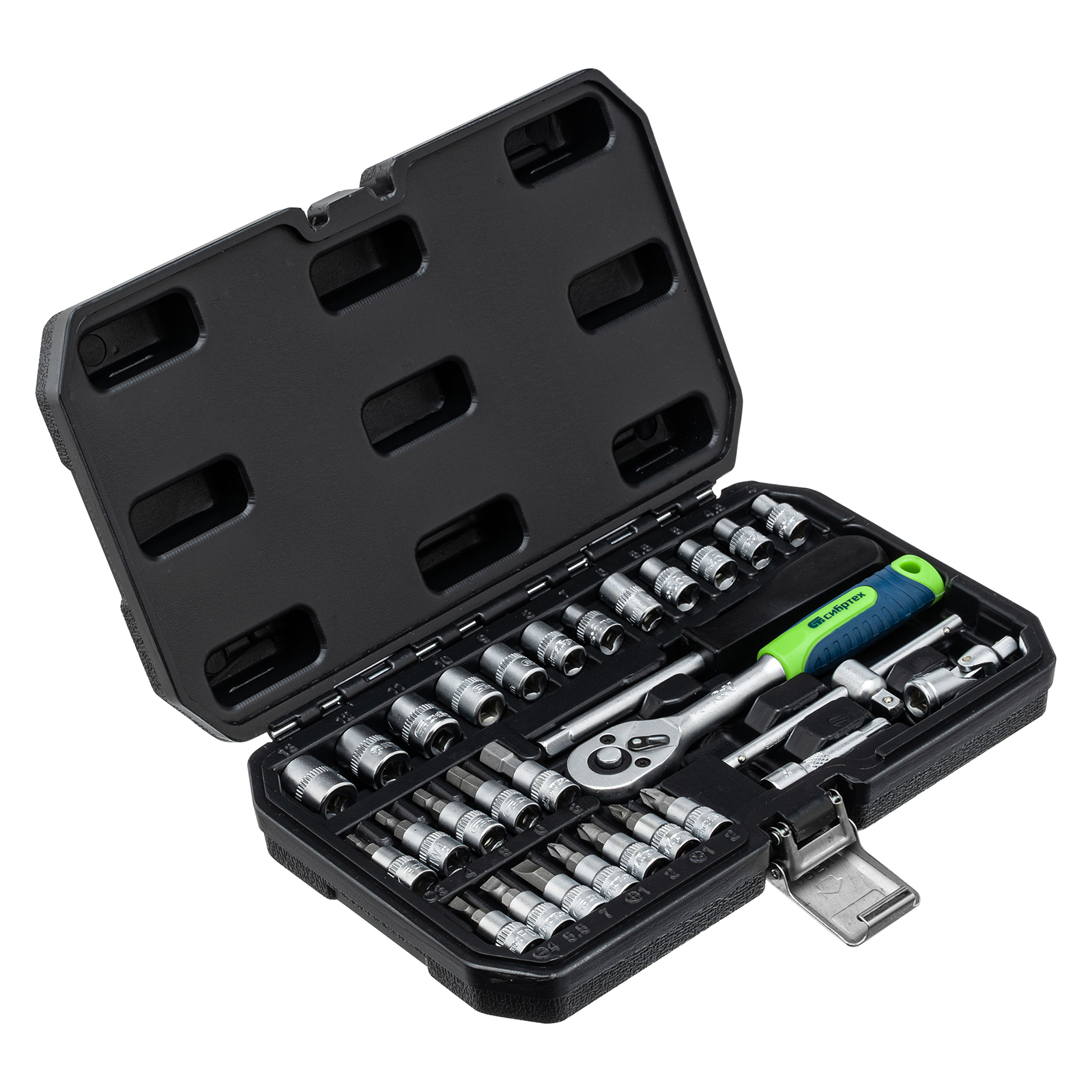 Набор инструментов Сибртех 13392, поставляющийся в пластиковом кейсе, состоит из 29 предметов с присоединительным размером 1/4", предназначенных для работы с резьбовыми соединениями. В комплект поставки входят кардан, удлинитель и вороток, упрощающие работу в труднодоступных местах. Набор будет полезен автолюбителю и домашнему мастеру.