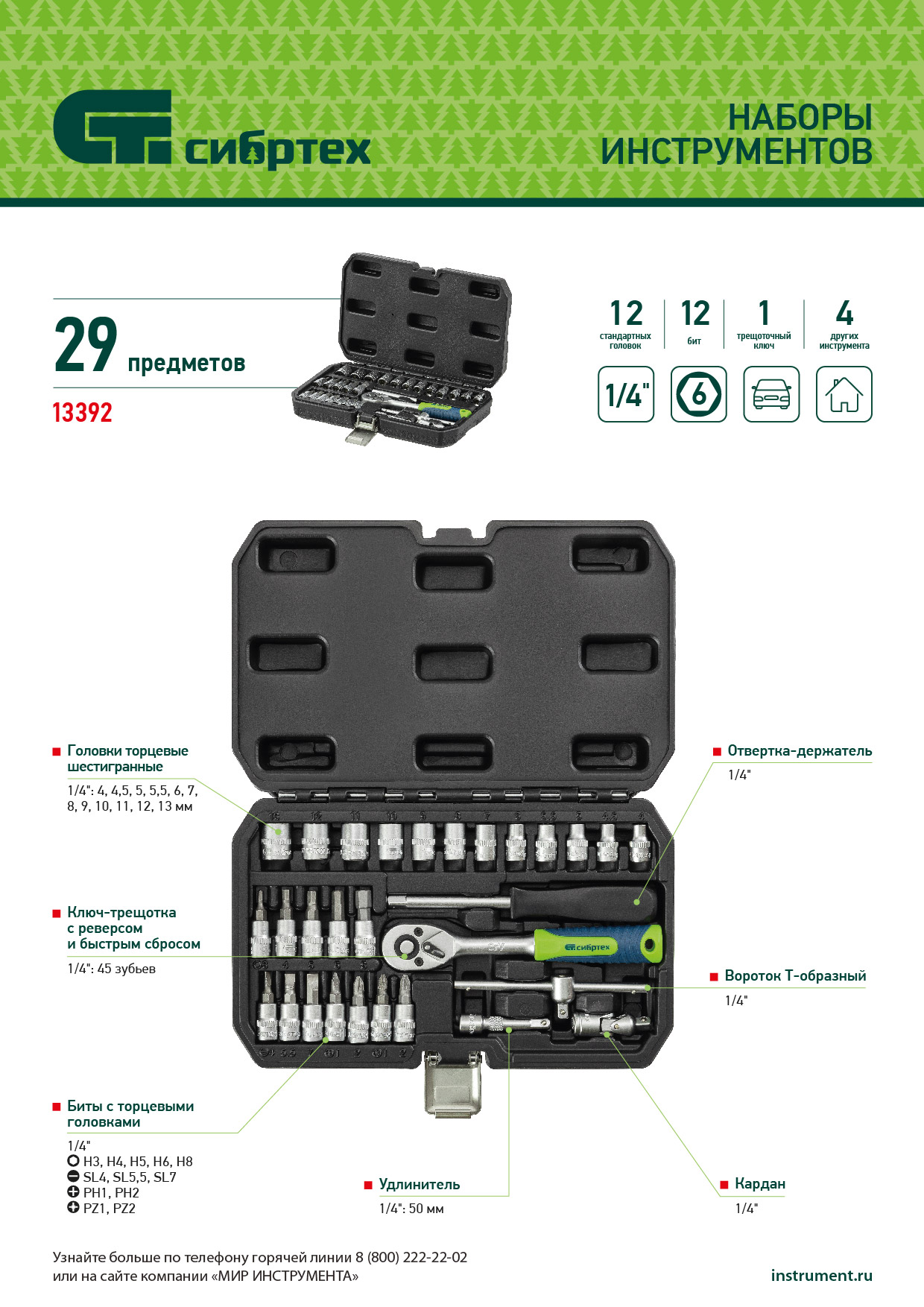 Набор инструментов, 1/4", пластиковый кейс, 29 предметов Сибртех в Екатеринбурге