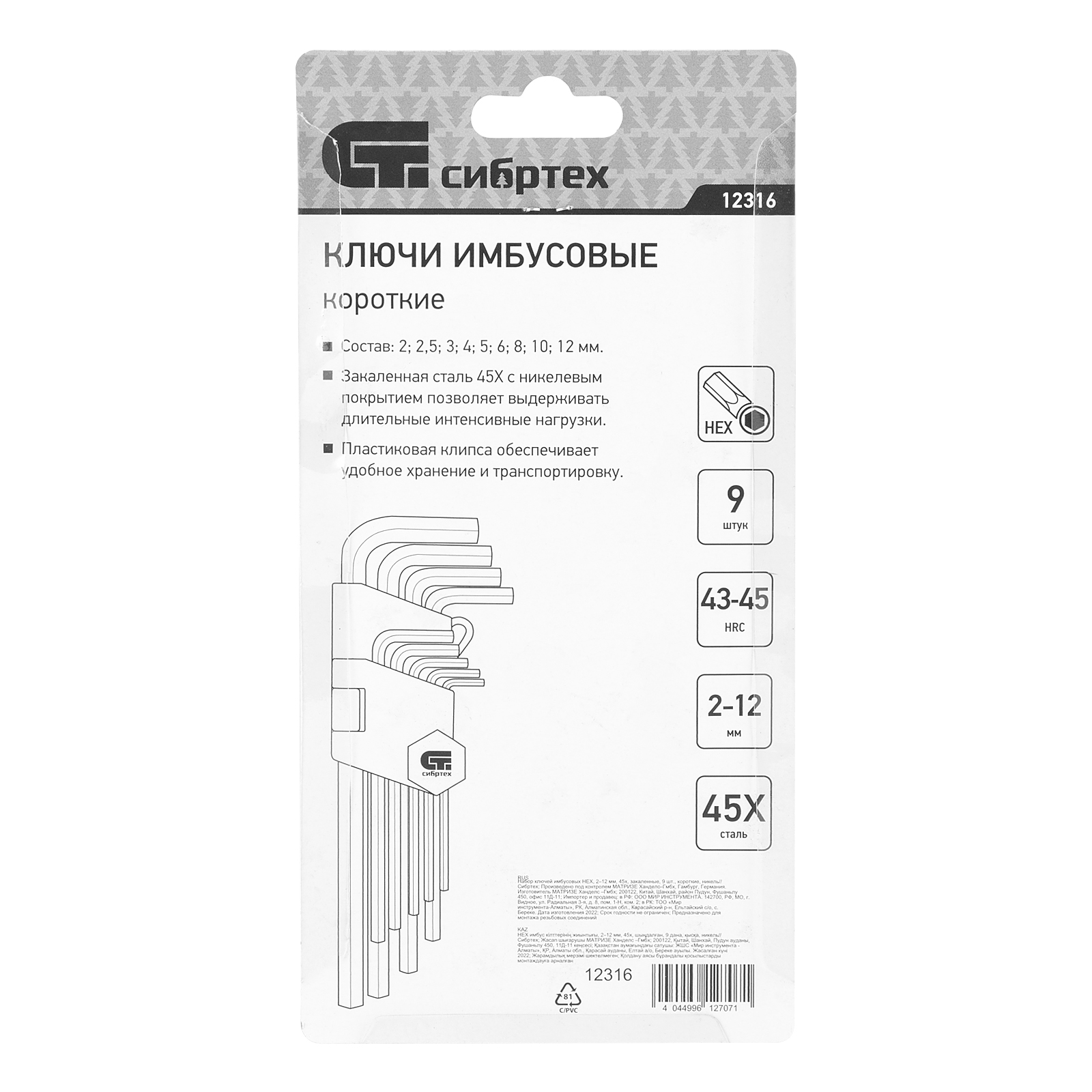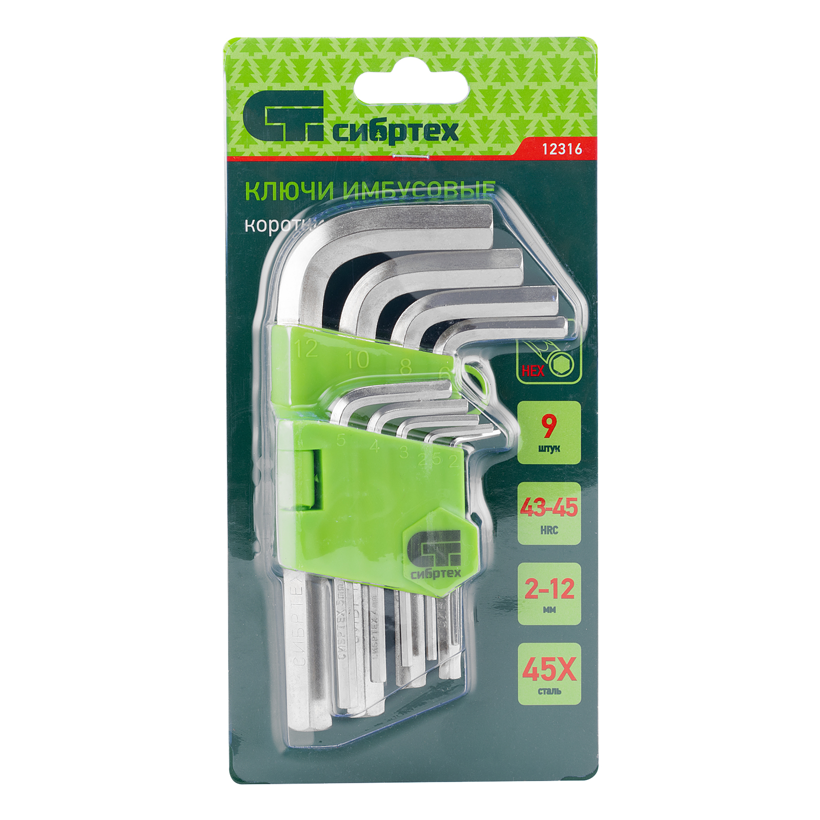 Набор ключей имбусовых HEX, 2-12 мм, 45x, закаленные, 9 шт, короткие, никель Сибртех в Екатеринбурге