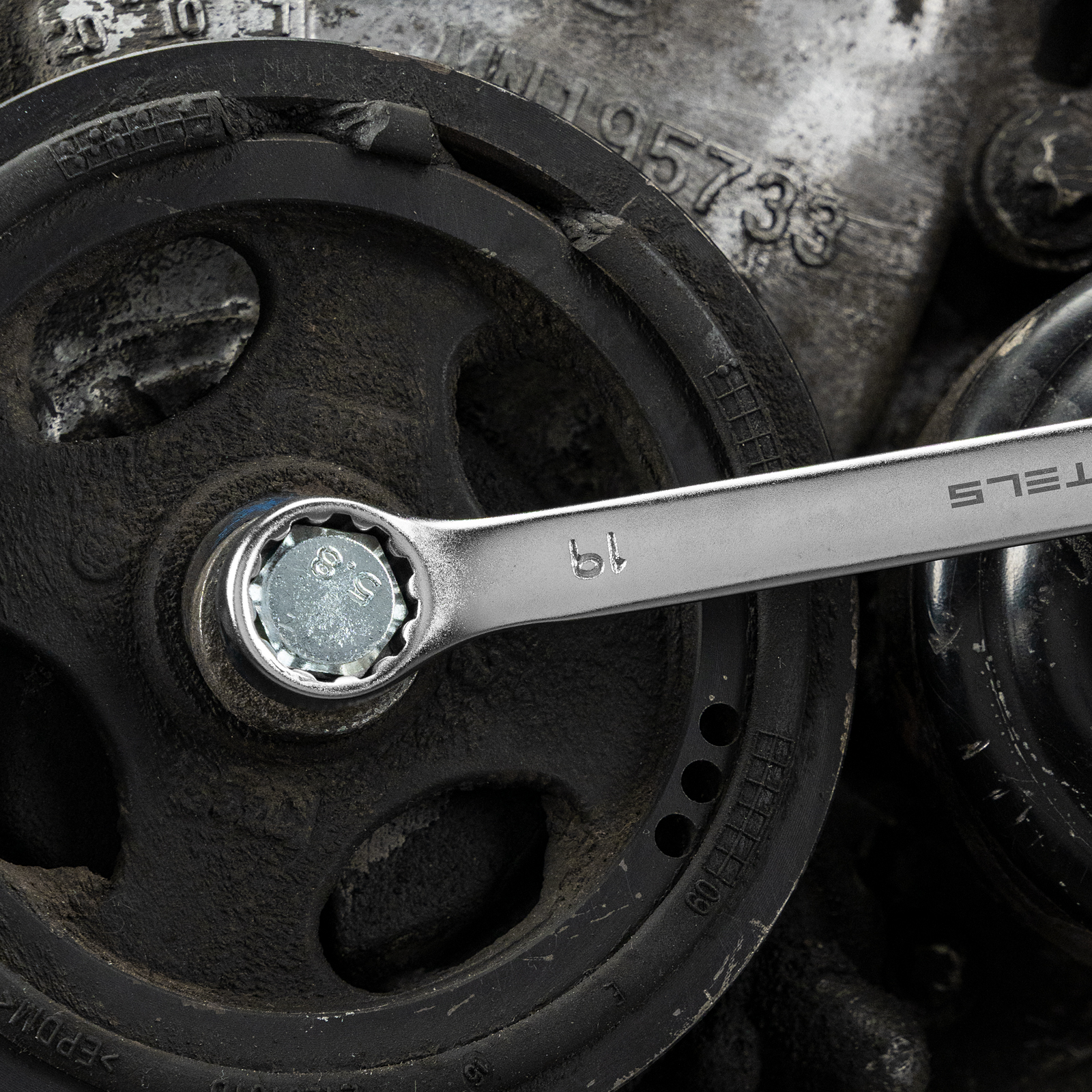 Набор Stels 15428 включает 8 комбинированных ключей из стали CrV, размером от 8 до 19 мм, покрытых матовым хромом, и используется для закручивания и откручивания гаечных и болтовых соединений. Накидная головка каждого ключа имеет 12-гранную внутреннюю поверхность, что облегчает работу с крепежом и уменьшает опасность его повреждения. Ключи применяются в слесарных мастерских и автосервисах, а также будут полезны для решения бытовых задач.