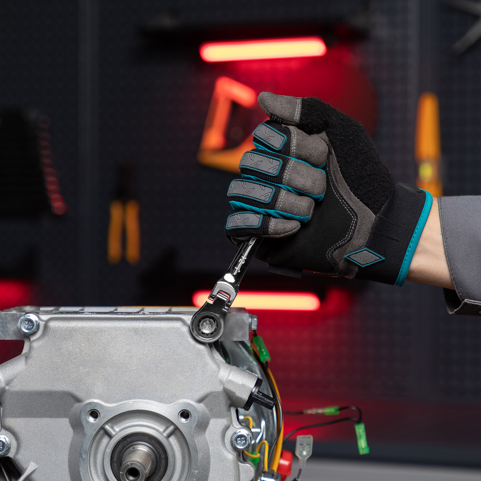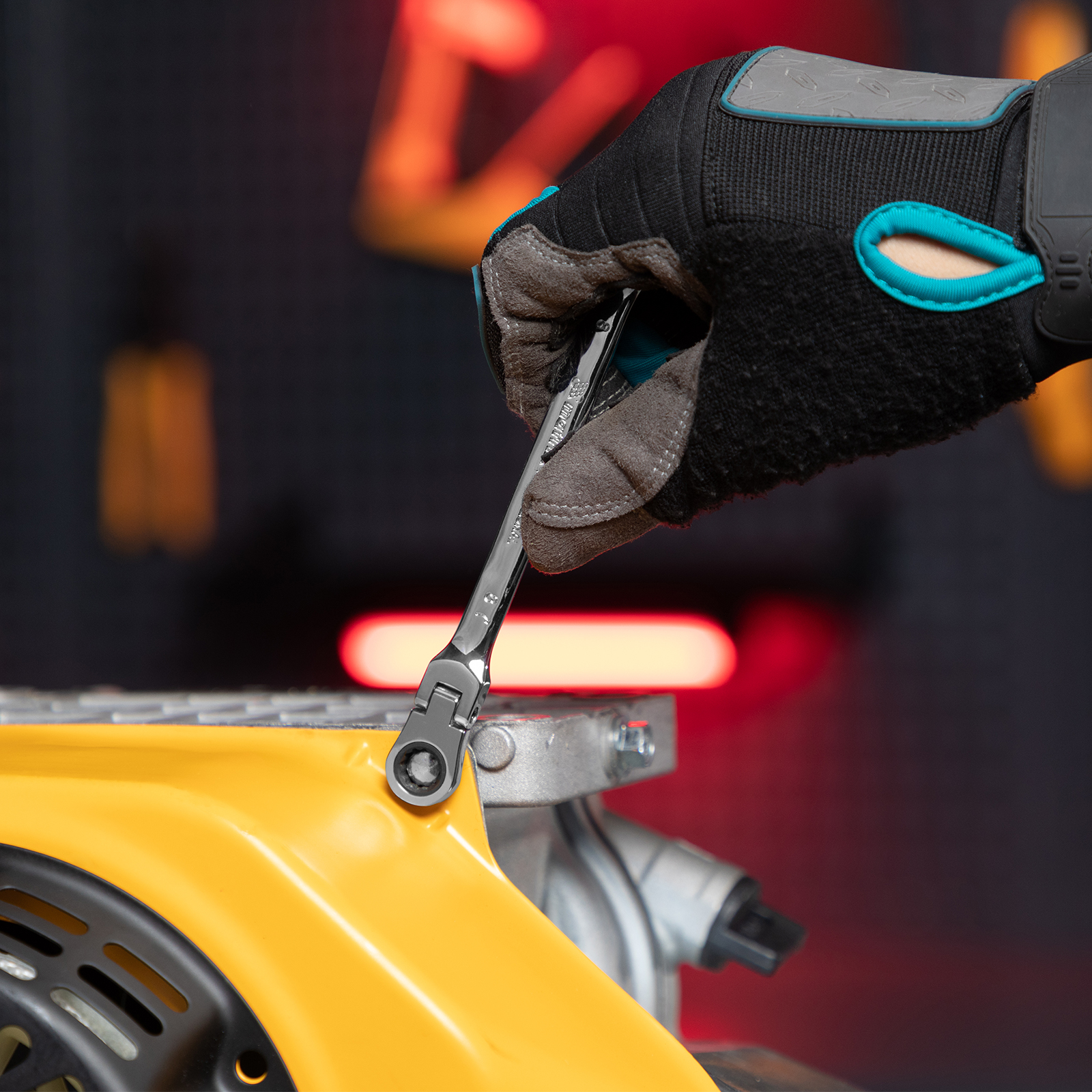 - Удобная работа в труднодоступных местах — храповой механизм на 72 зуба обеспечивает плавное вращение (шаг трещотки составляет 5°), а шарнир позволяет поворачивать рабочую часть под углом.