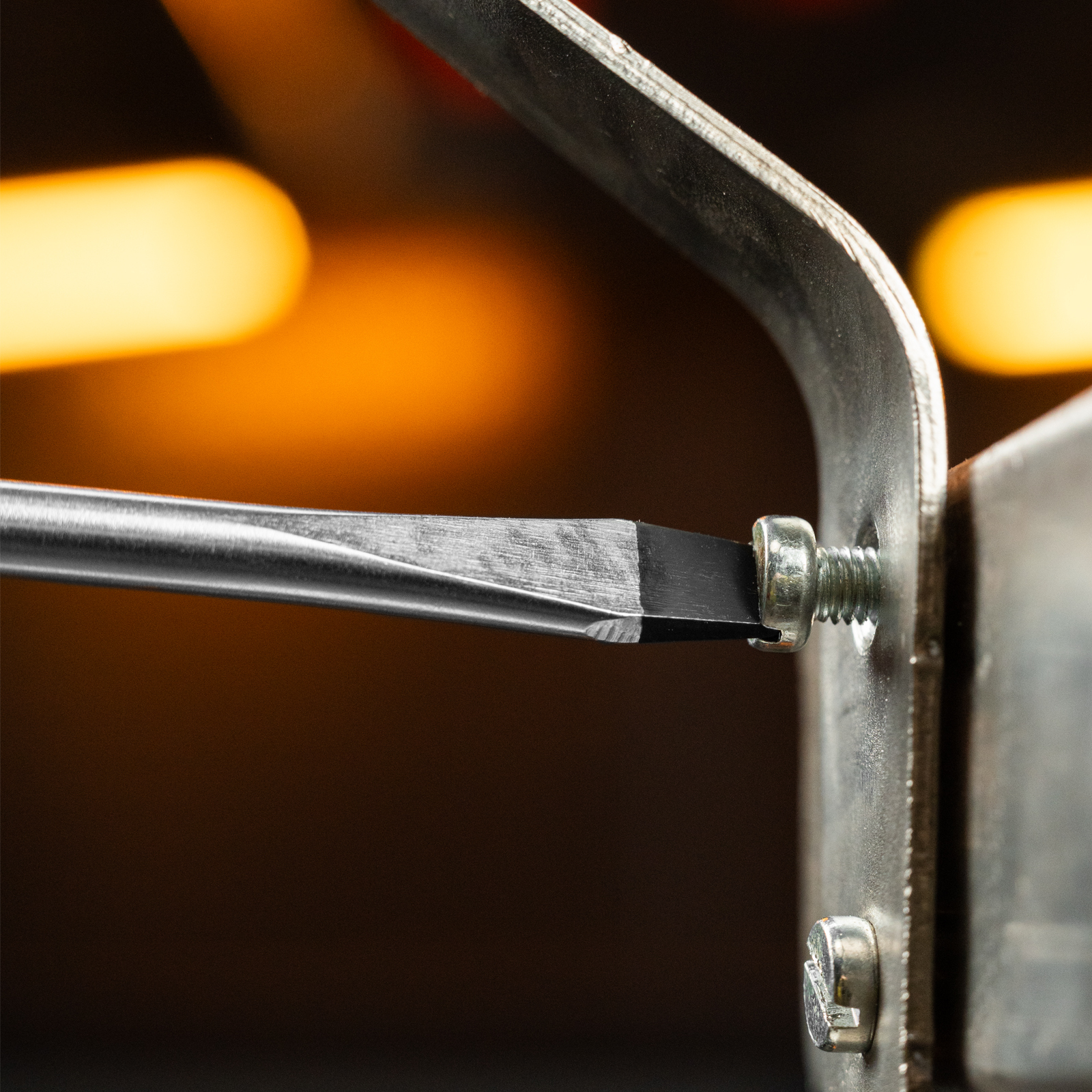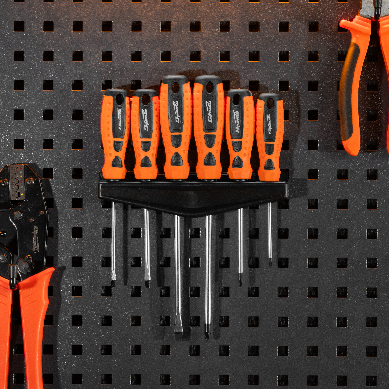 - Подвесная полка обеспечивает удобное хранение отверток, также на рукоятке каждого инструмента предусмотрено отверстие для подвесного хранения.