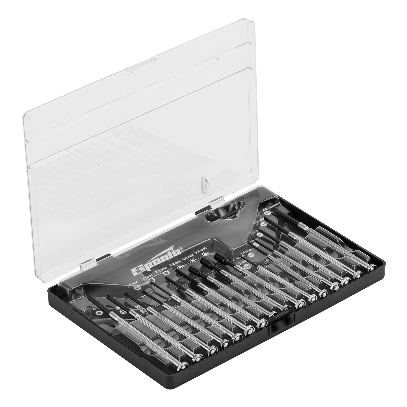 Отвертки для точной механики: РН000, РН00, РН0, РН1, SL1.2, SL1.4, SL2, SL2.4, SL3, SL3.5, H1.5, H2, H2.5 - 13 штТорцевые головки: 3, 4, 5 - 3 штПластиковый кейс - 1 шт |