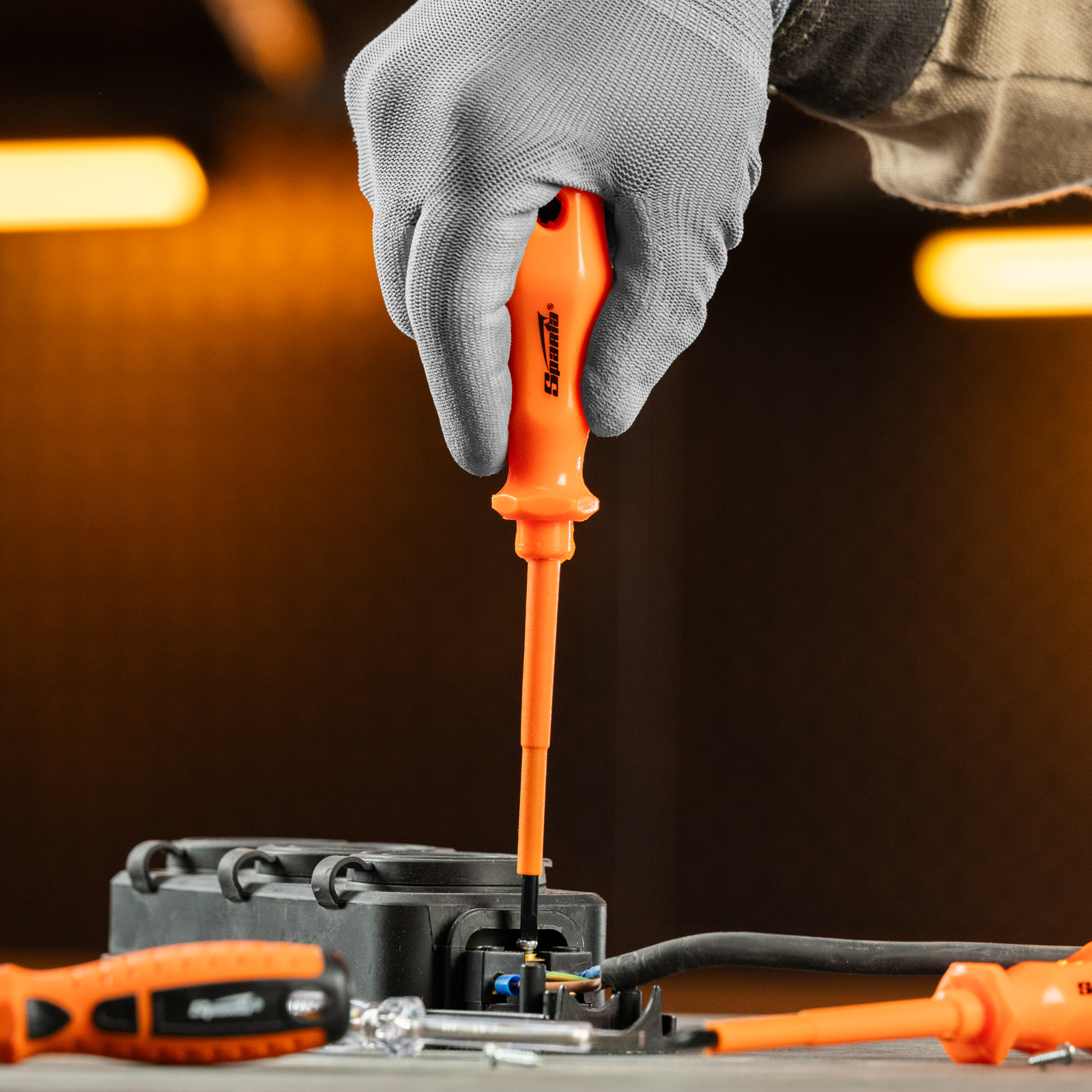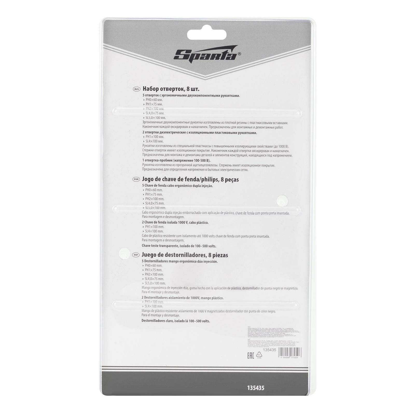 Набор отверток Sparta 135435 включает 8 предметов: 5 отверток для монтажа/демонтажа крепежных элементов с профилем PH и SL, 2 диэлектрические отвертки и электрический пробник на 220 В. Он пригодится для ремонта и обслуживания электрооборудования в быту. Важно — техника безопасности исключает проведение работ под напряжением!