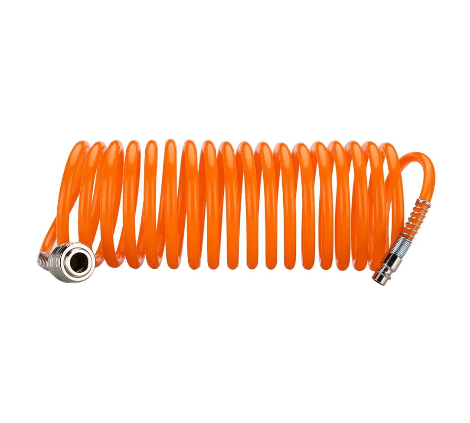 - Удобное использование — спиральный шланг не перегибается и не нуждается в скручивании после окончания работ, а его длины 5 м достаточно для свободного передвижения по рабочей зоне.