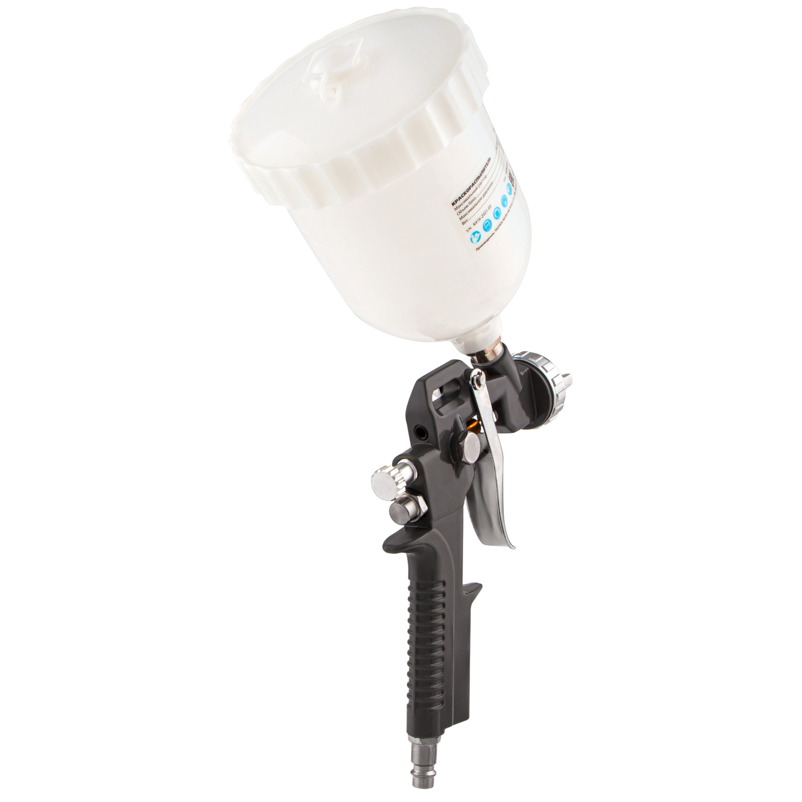 - Контроль количества краски — бак краскораспылителя выполнен из прозрачного пластика, а благодаря верхнему расположению его удобно заправлять.
