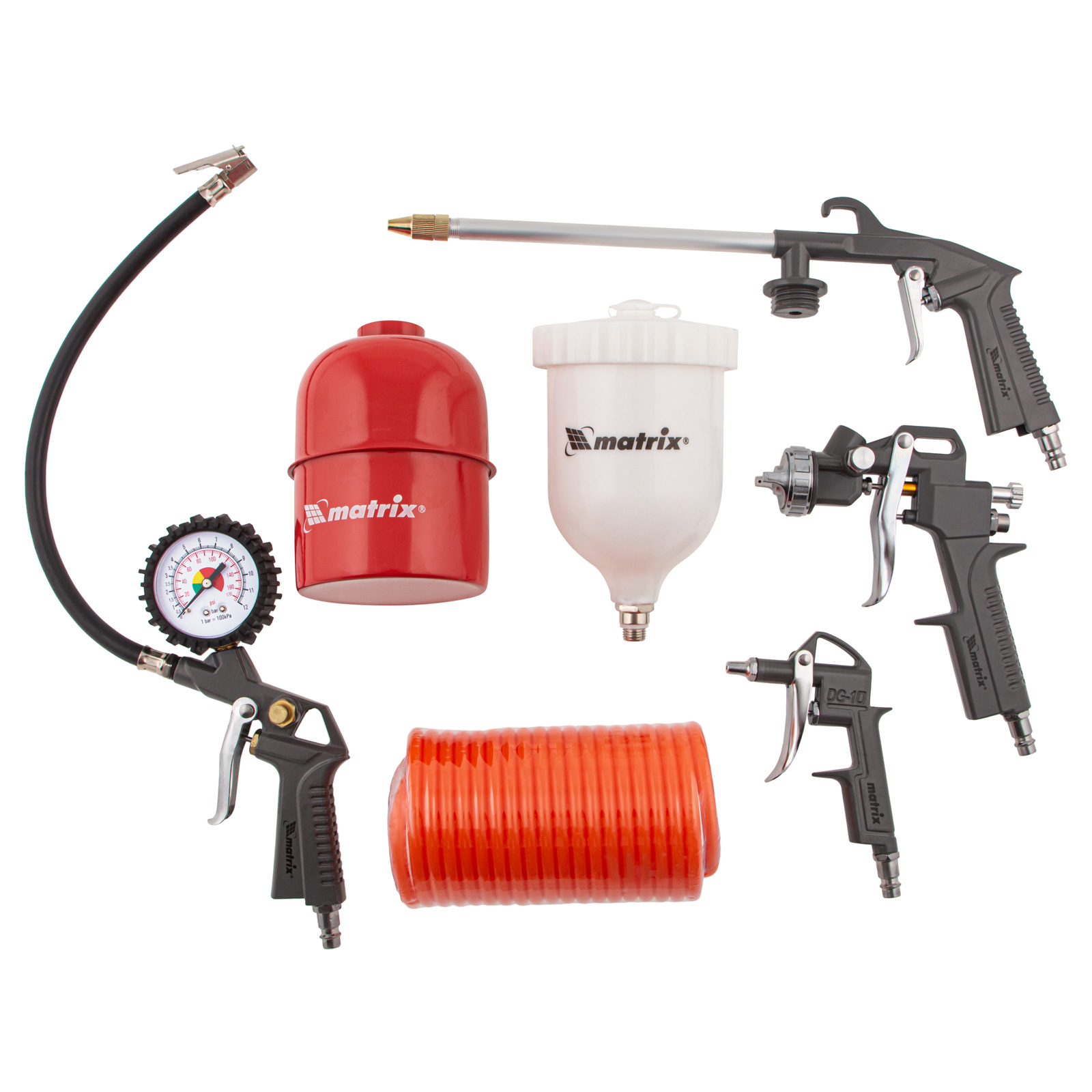 Набор пневмоинструмента Matrix 57304 включает 5 предметов: промывочный пистолет, продувочный пистолет, пневмопистолет для накачки шин, краскораспылитель с верхним бачком и шланг с быстросъемным соединением. Пневмоинструменты совместимы со всеми типами компрессоров. Набор пригодится в автомастерской, на мебельном производстве, в гараже или при проведении ремонта.,С помощью краскораспылителя можно покрасить поверхности или покрыть их защитными составами. Промывочный пистолет предназначен для очистки и смазки различных поверхностей. Пистолет для подкачки шин позволяет измерить давление в шине и накачать ее. Продувочный пистолет очищает поверхности и детали струей сжатого воздуха, а спиральный шланг служит для подключения пневмоинструмента к компрессору.
