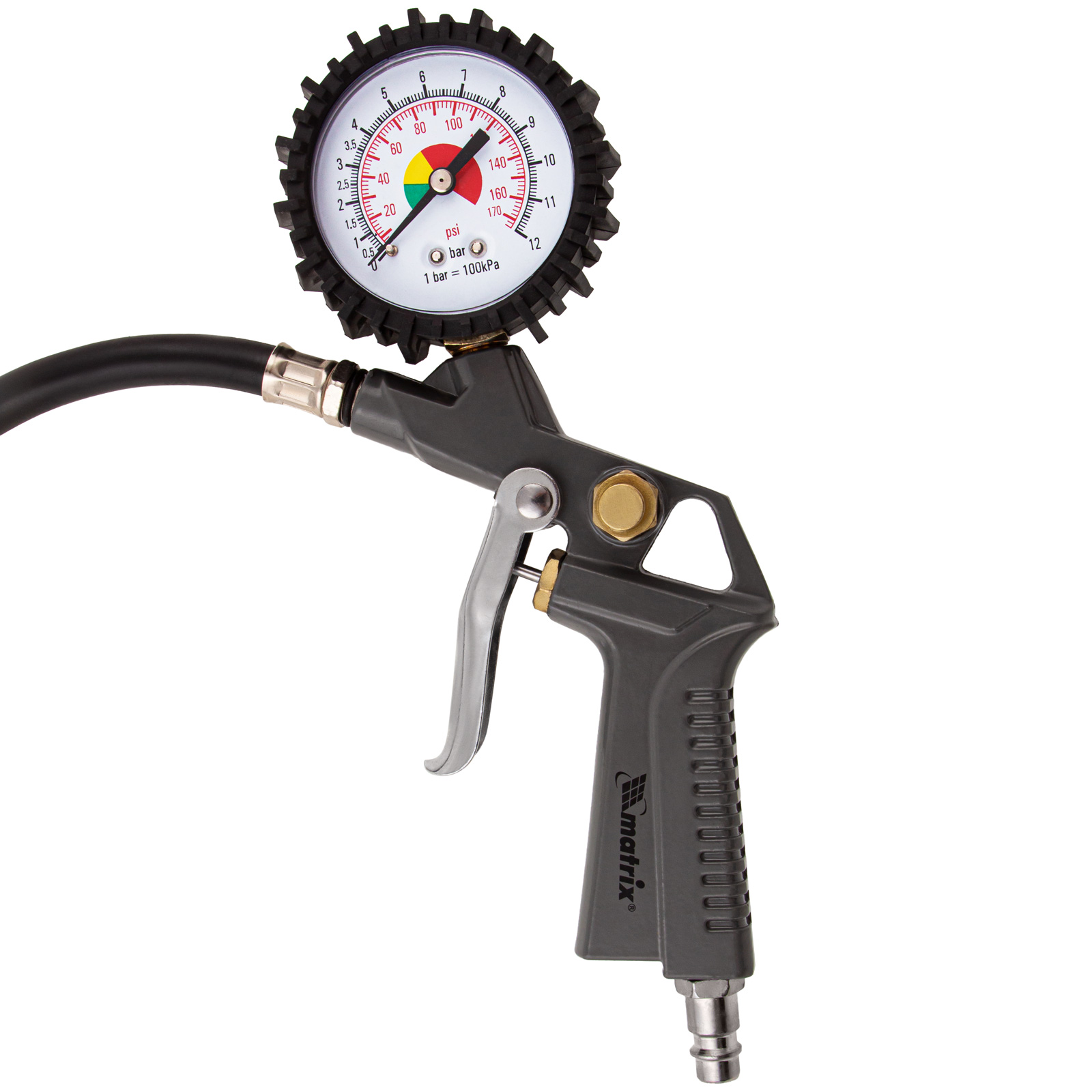 - Контроль давления — пистолет подкачки шин оснащен точным аналоговым манометром.