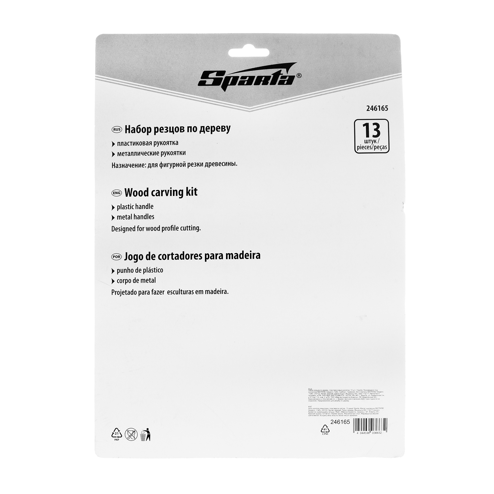 Набор Sparta 246165 включает 13 резцов по дереву и пластмассовую рукоятку. Позволяет выполнять резьбу разного типа: геометрическую, контурную, ажурную и рельефную. Благодаря 3 рукояткам можно заранее подготовить к работе необходимые лезвия.
