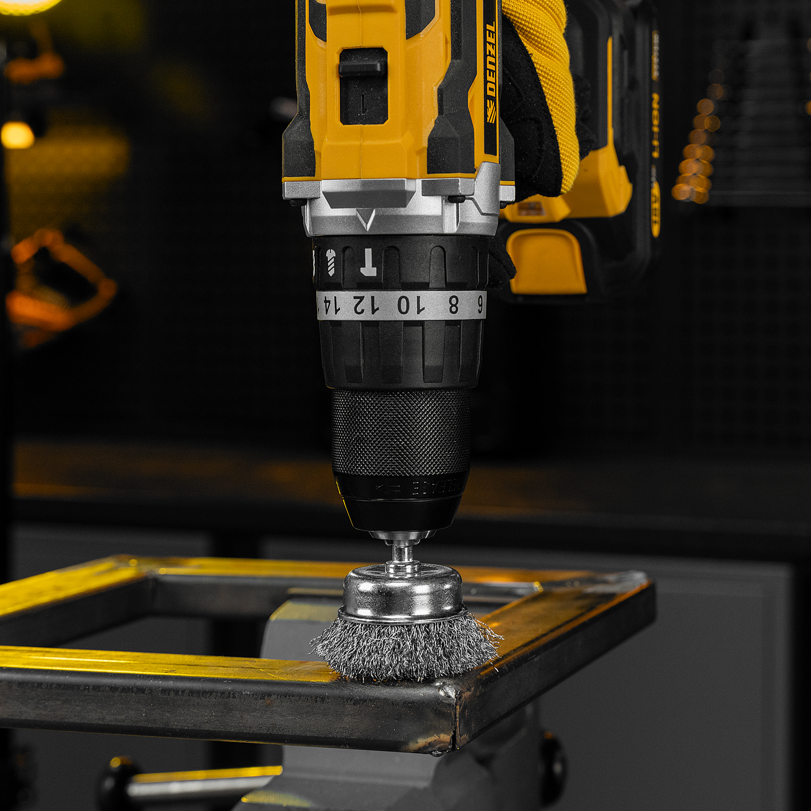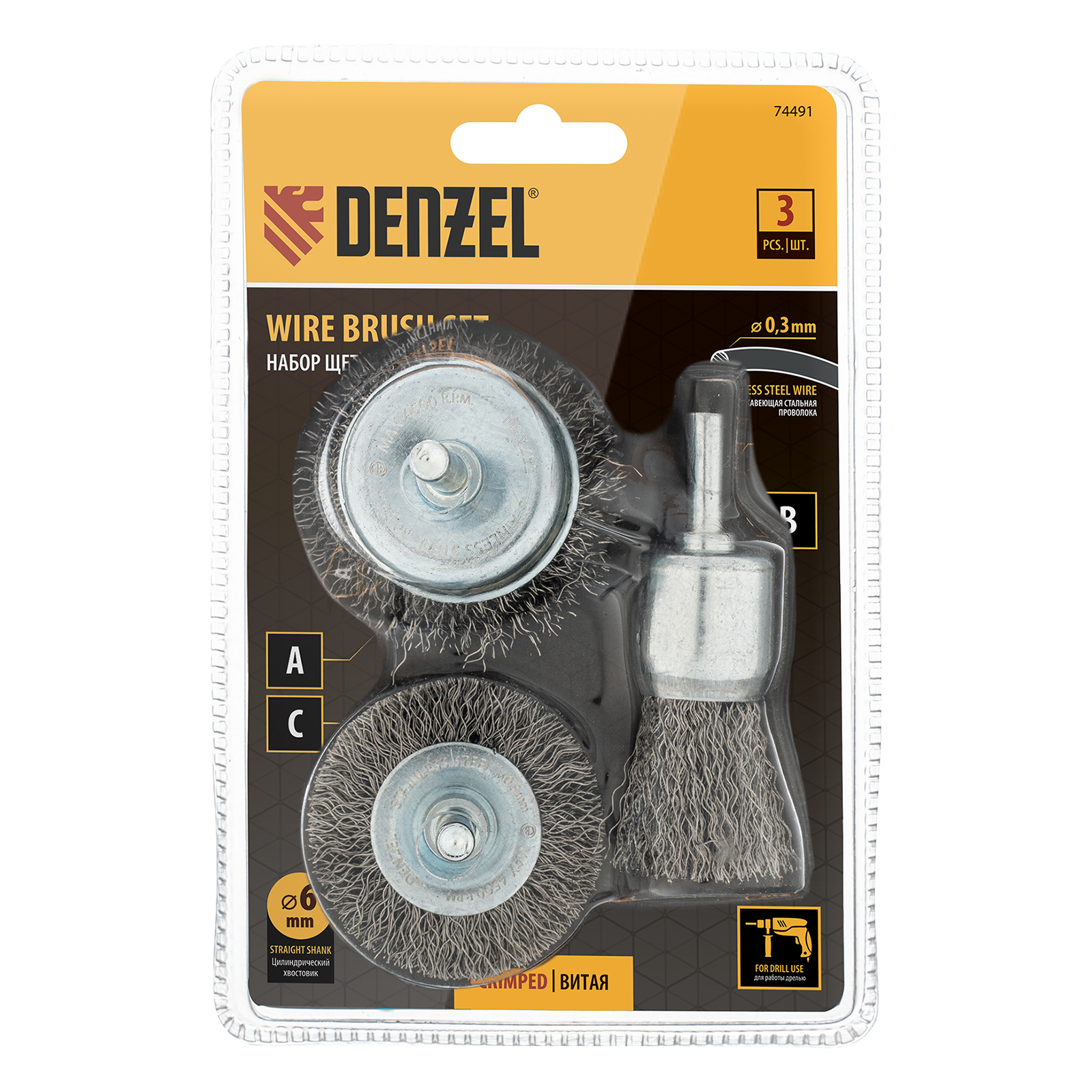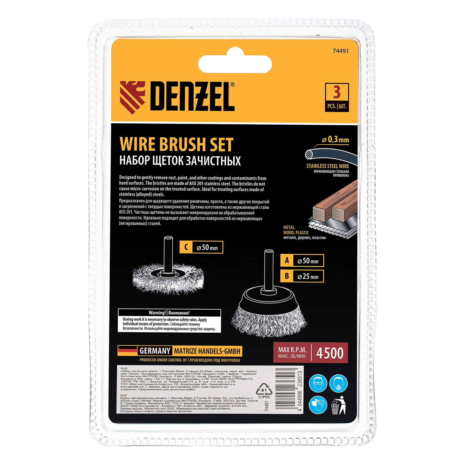 Набор щеток для дрели, 1 Плоская 50мм, 2 Чашки 25-50мм, шпилька, нерж. вит. проволока Denzel в Екатеринбурге
