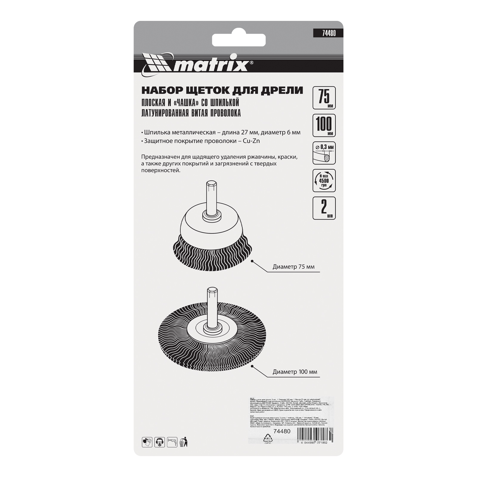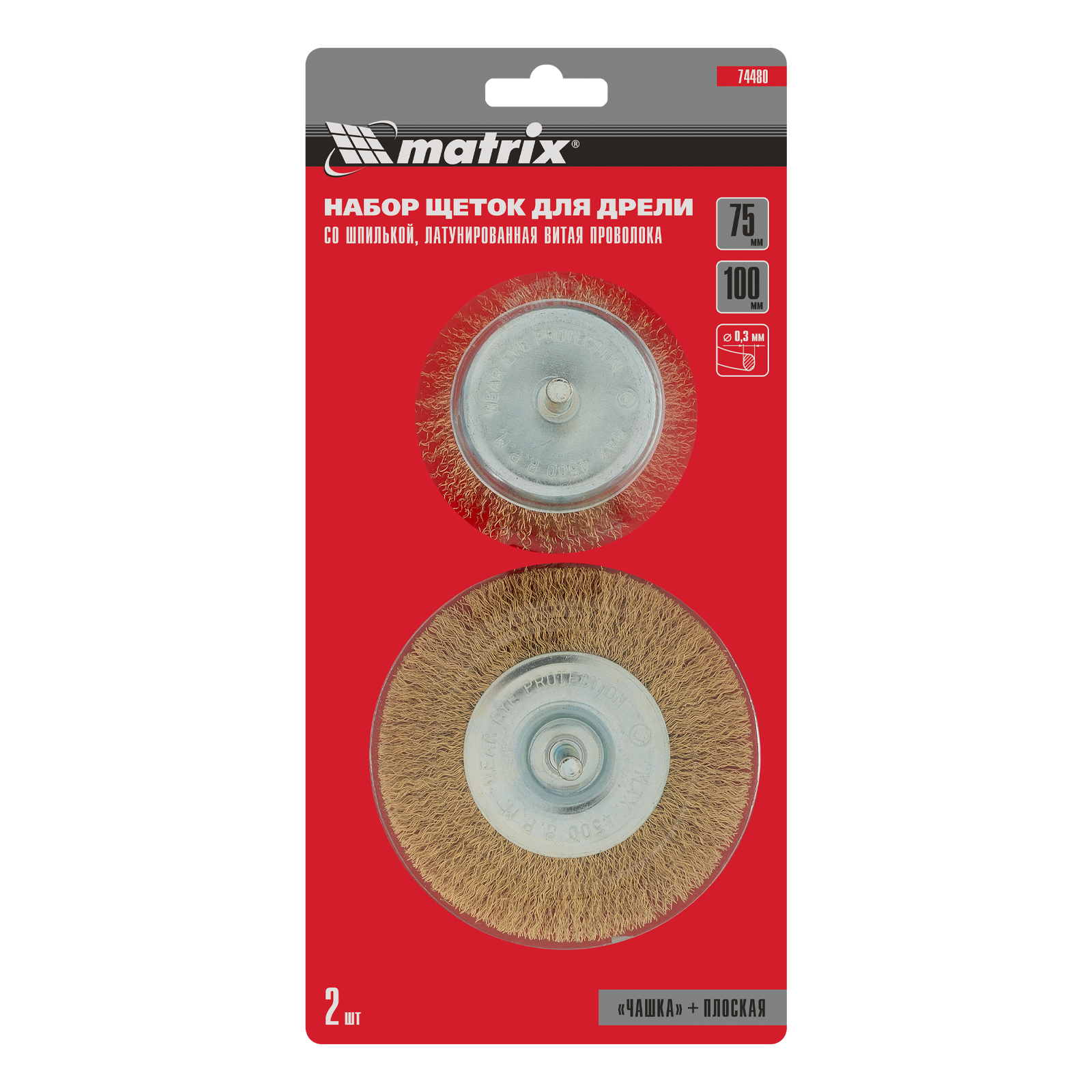 Набор щеток для дрели, 2 шт, 1 плоская, 100 мм, 1 "чашка", 75 мм, со шпильками Matrix в Екатеринбурге