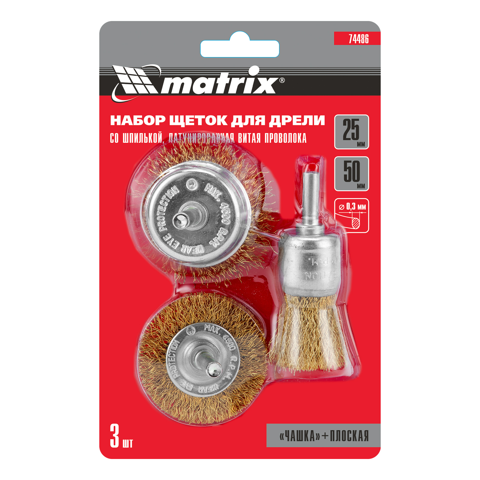 Набор щеток для дрели, 3 шт, 1 плоская, 50 мм, 2 "чашки", 25-50 мм, со шпильками Matrix в Екатеринбурге