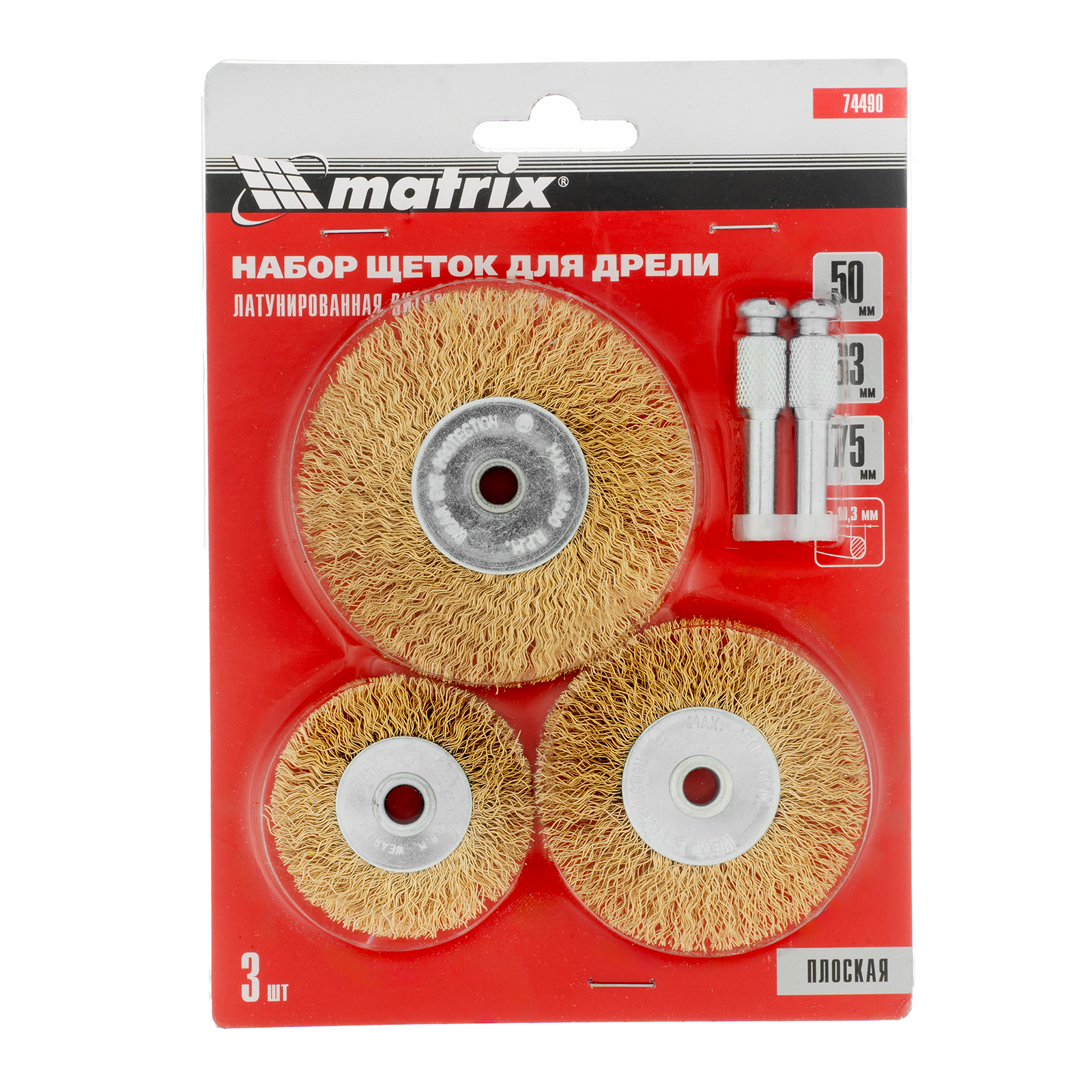 Набор Matrix 74490 состоит из 3 плоских щеток размером 50-63-75 мм, со шпильками диаметром 6 мм, предназначенных для установки на дрель. Рекомендованная скорость вращения шпинделя — не более 4500 об/мин. Щетки используются для удаления ржавчины, загрязнений и старых ЛКМ с поверхностей. Плоские насадки пригодятся там, где неудобно работать обычными — в углах и пазах.