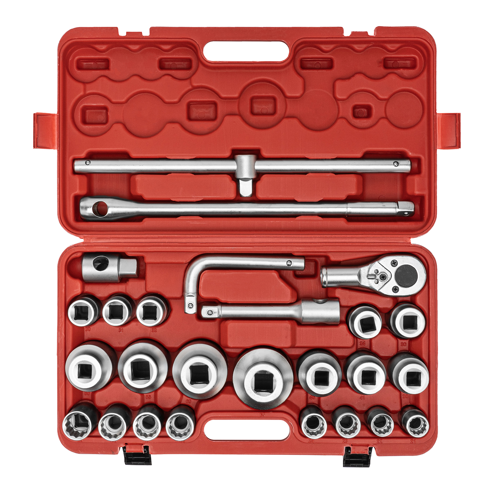 Ключ трещотка - 1 штВороток Т-образный T-образный - 1 штУдлинитель 190, 510 - 2 штВороток Т-образный L-образный - 1 штПереходник - 1 штГоловки 21, 22, 23, 24, 26, 27, 28, 29, 30, 31, 32, 34, 36, 38, 41, 46, 50, 55, 60, 65 - 20 штКейс - 1 шт |