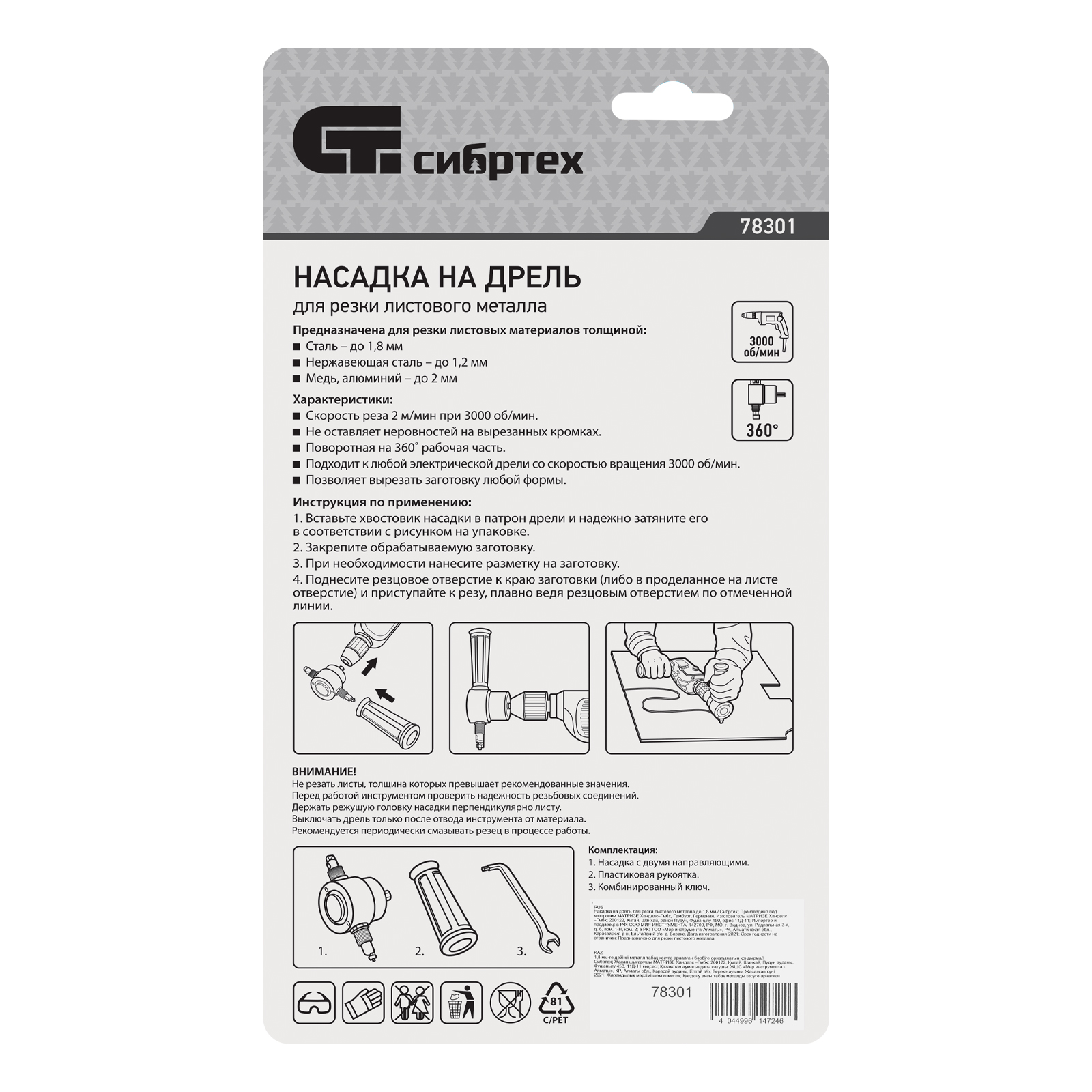 Насадка на дрель для резки листового металла Сибртех 78301 позволяет разрезать сталь толщиной до 1,8 мм, нержавеющую сталь толщиной до 1,2 мм, медь и алюминий — до 2 мм. Ширина реза составляет 6 мм, он может быть не только прямым, но и фигурным. Приспособление устанавливается на электрические дрели со скоростью вращения 3000 об/мин. Насадка для резки металла будет полезна при проведении кровельных работ, а также пригодится в слесарной мастерской, на даче или в гараже.