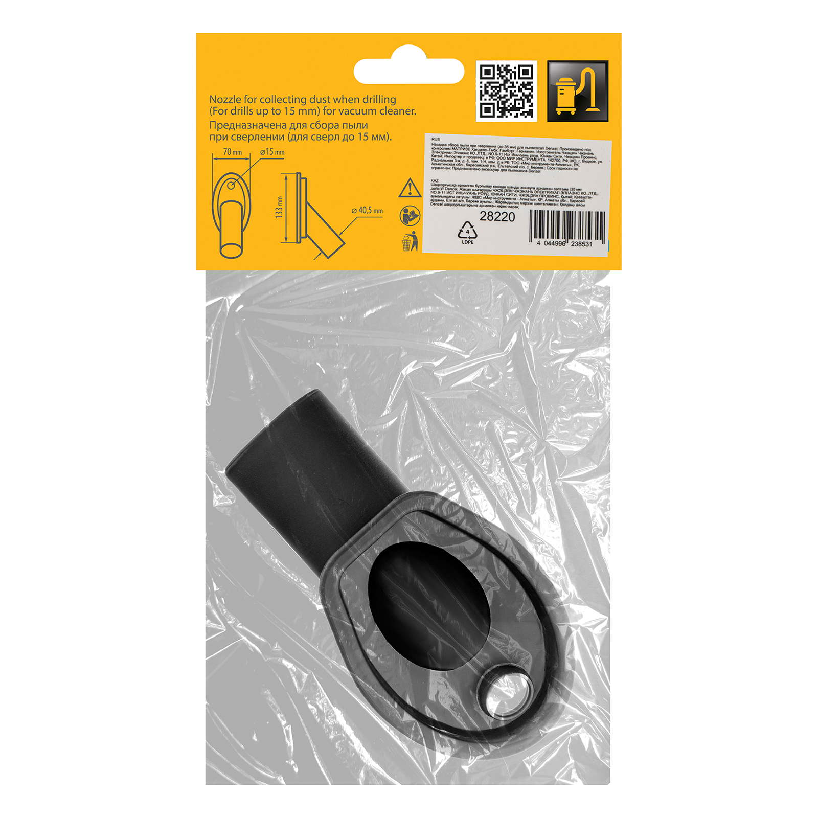 Насадка для пылесоса Denzel 28220 предназначена для моментального сбора пыли, образующейся при сверлении поверхностей. Подходит для использования со сверлами диаметром до 15 мм. Пригодится во время проведения строительных и ремонтных работ. Насадка совместима с пылесосами Denzel 28201, 28202, 28203, 28291, 28292, 28293.