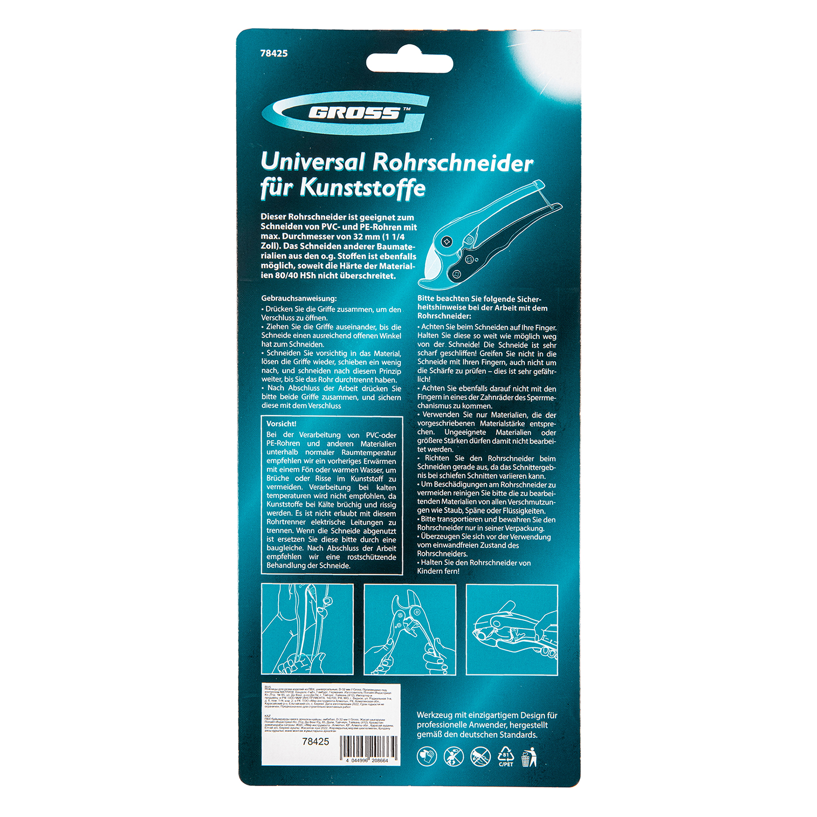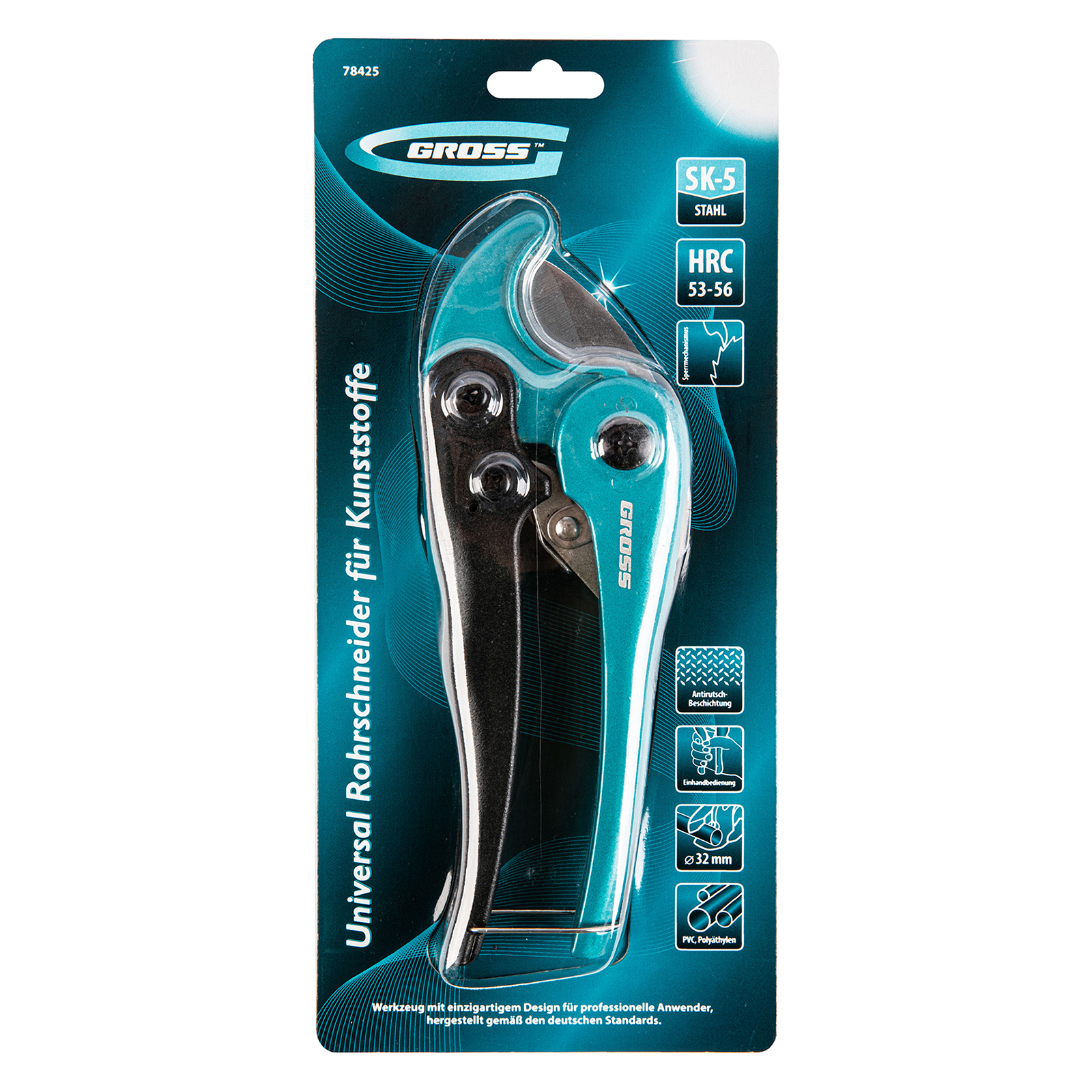 Универсальные ножницы для резки изделий из ПВХ Gross 78425 применяются для работы с пластиковыми трубами диаметром до 32 мм, а также для разрезания профилей, плинтусов, галтелей, реек, планок, резиновых шлангов и других предметов. Прямой нож инструмента позволяет резать плоские заготовки. Ножницы пригодятся для выполнения сантехнических и отделочных работ.