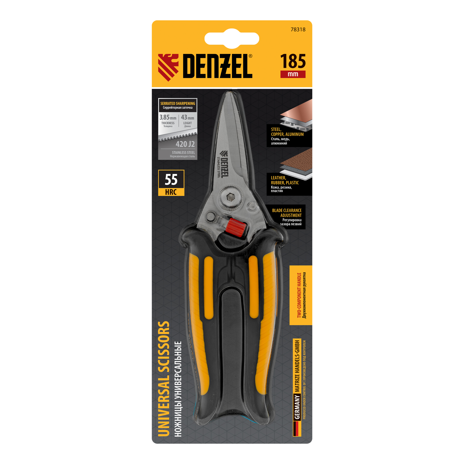 Универсальные ножницы Denzel 78318 длиной 185 мм — инструмент для разрезания тонкого металла и мягких материалов. Одно из лезвий имеет серрейторную (зубчатую) заточку, поэтому разрезаемый материал не выскальзывает из инструмента. Ножницы подходят для выполнения разнообразных работ: на даче помогут разрезать стальную сетку с небольшим диаметром проволоки, в походе — ветки или рыбу, во время мелкого ремонта или занятий творчеством — провода, кожу, резину, картон, бумажную лозу и другие материалы.