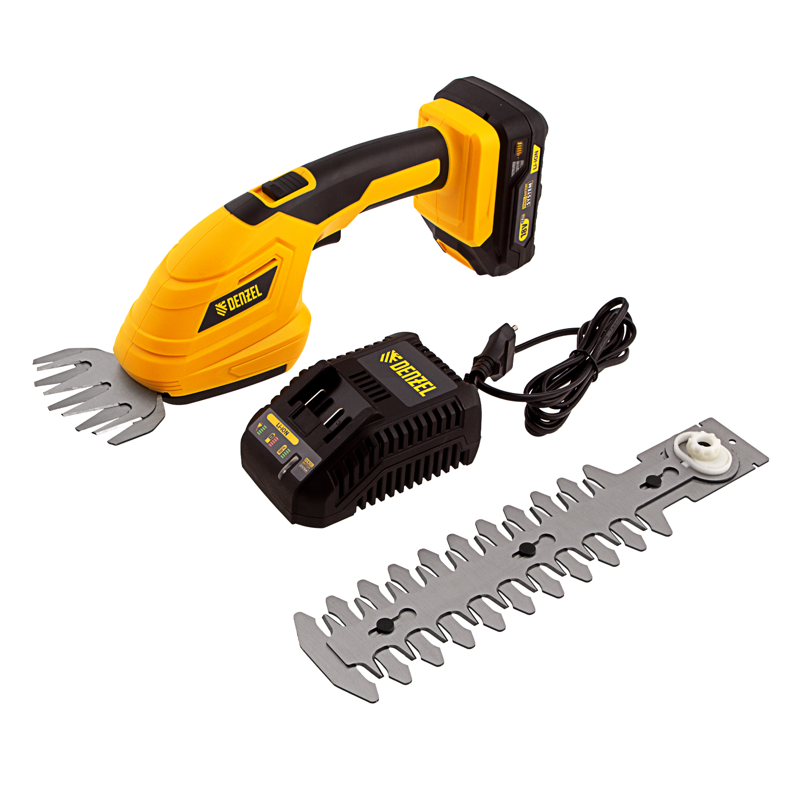 Ножницы-кусторез аккумуляторные - 1 штЛезвие для кустарника с чехлом - 1 штЛезвие для травы с чехлом - 1 штБатарея аккумуляторная - 1 штУстройство зарядное - 1 штРуководство по эксплуатации с гарантийным талоном - 1 штМодуль для подстригания травы - 1 штМодуль для ухода за кустами - 1 шт |