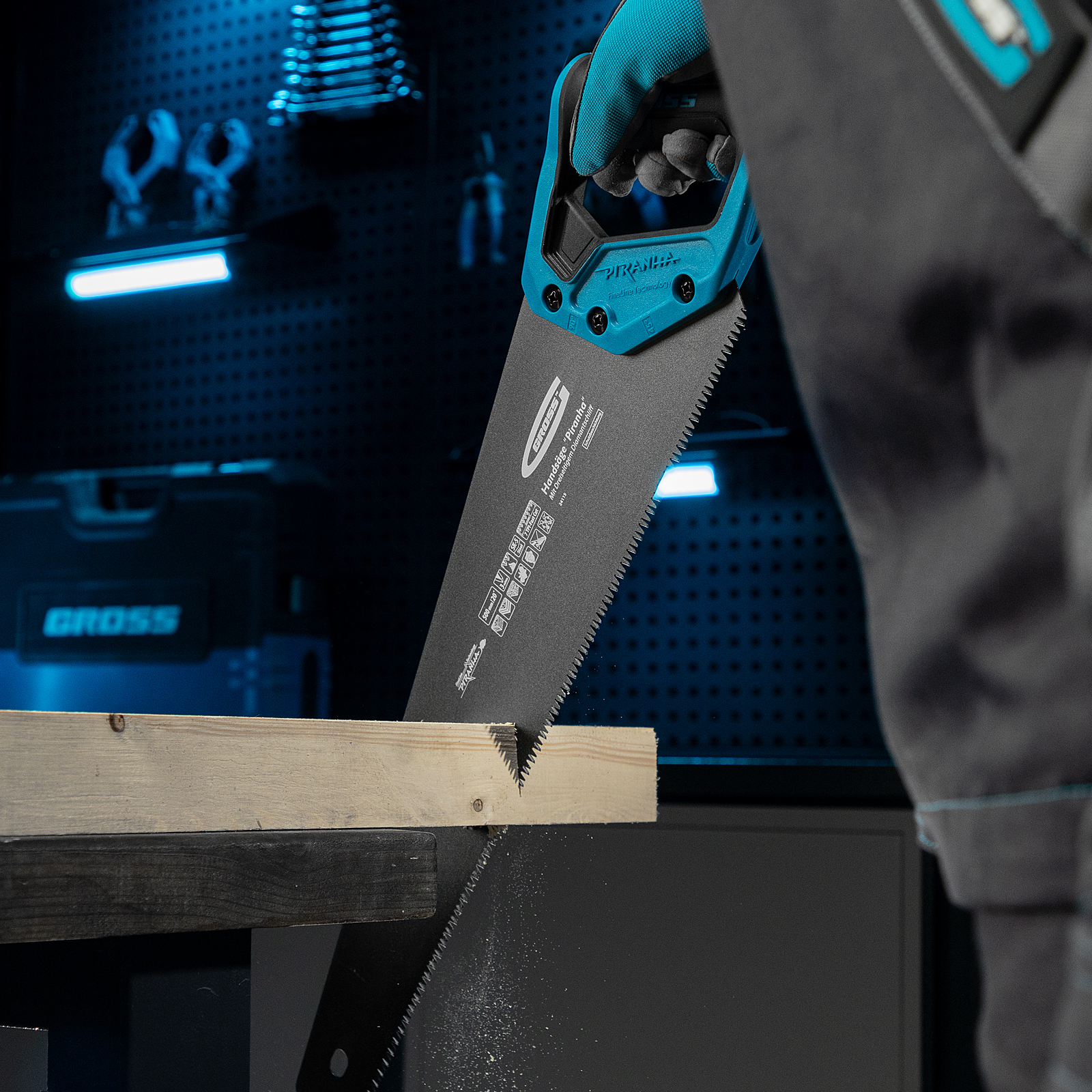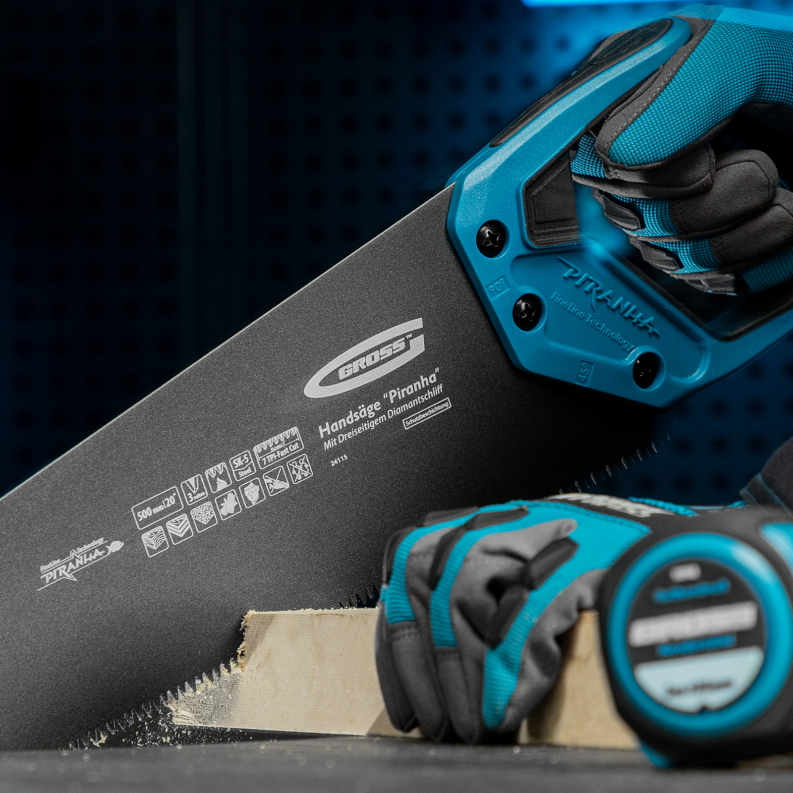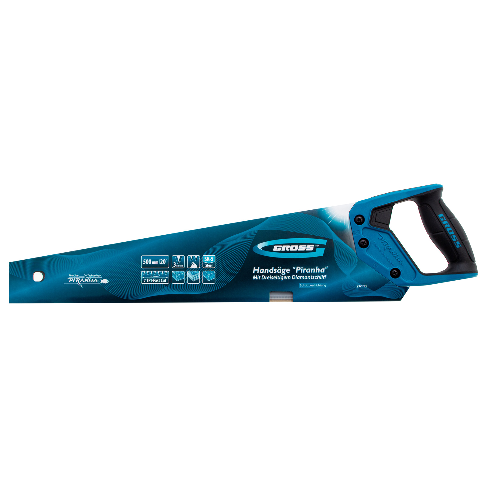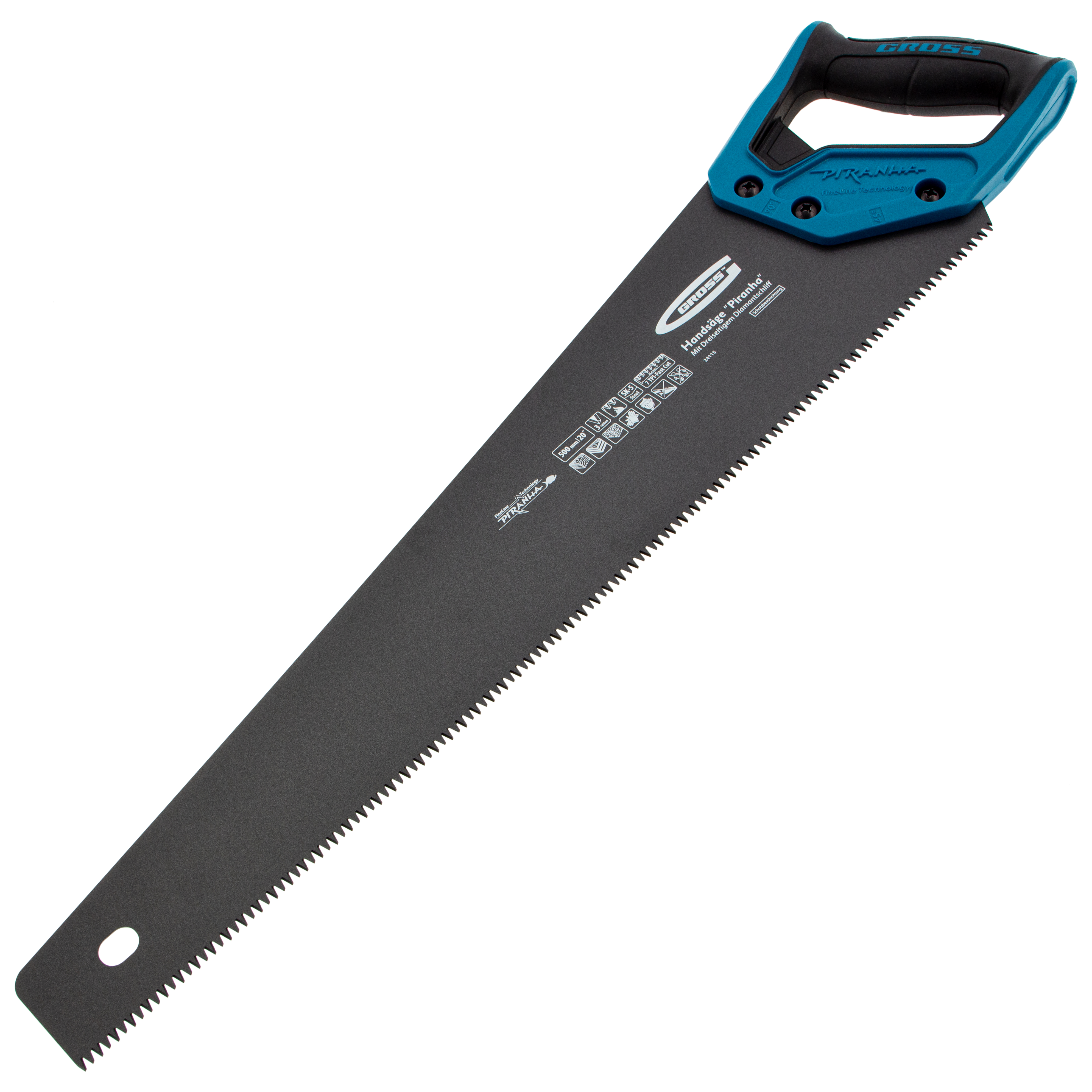 Ножовка по дереву Gross PIRANHA 24115 с полотном длиной 500 мм, калеными зубьями с 3D-заточкой и шагом 7 TPI, с тефлоновым покрытием полотна и 2-компонентной рукояткой, используется для продольного и поперечного распиливания древесины различных пород, МДФ, ДСП, ДВП, ламината, а также пенополистирола, полиуретана и других синтетических материалов. Рабочая часть состоит из крупных зубьев, поэтому ножовка подходит для решения широкого спектра задач. Трехгранная заточка зубьев увеличивает производительность инструмента без потери качества распиловки. Ножовка предназначена для столярных работ.