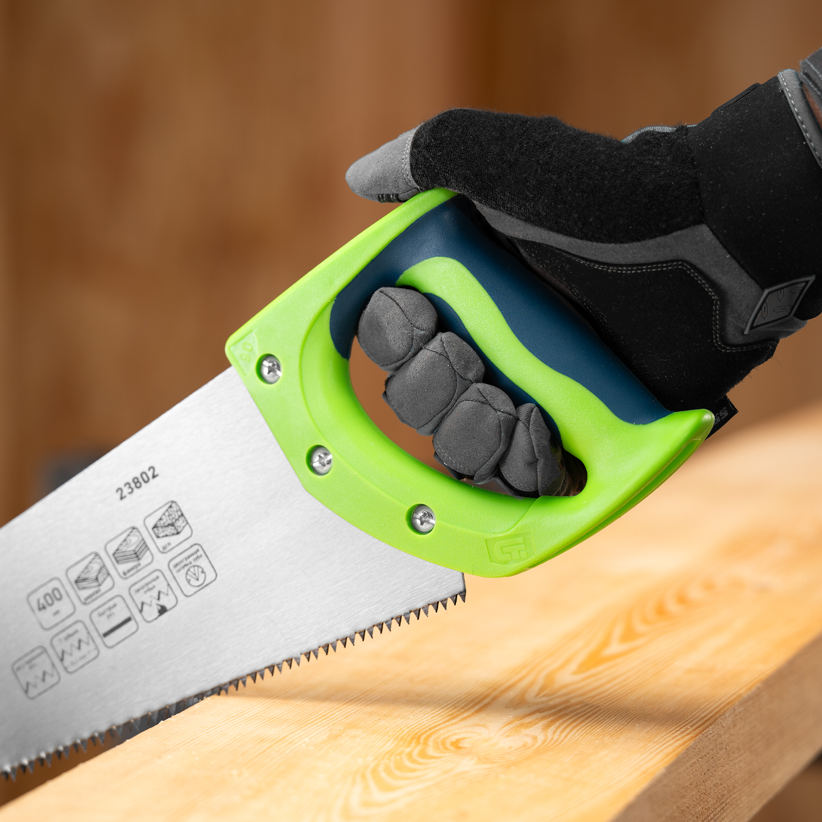 Ножовка по дереву Сибртех «Зубец» 23802 с полотном длиной 400 мм, калеными зубьями с 2D-заточкой и шагом 7-8 TPI, с двухкомпонентной рукояткой, используется для распиливания заготовок из древесины, фанеры и ДСП. Рабочая часть, содержащая 7-8 зубьев на дюйм, обеспечивает быстрый двусторонний рез. Режущую кромку можно перетачивать при необходимости. Ножовка будет полезна столяру, плотнику и домашнему мастеру.