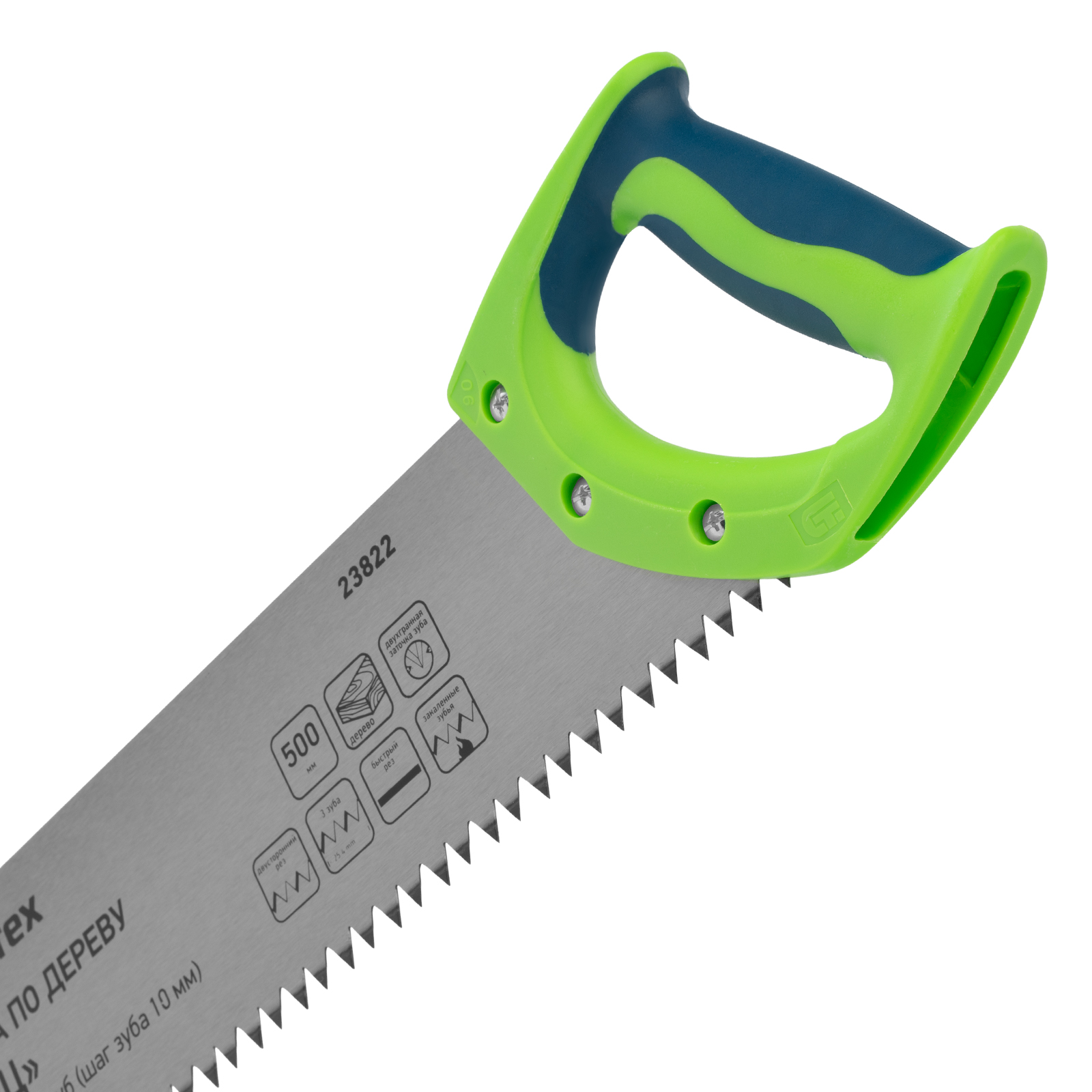 Ножовка по дереву Сибртех «Зубец» 23822 с полотном длиной 500 м, с калеными зубьями с шагом 10 мм и 2D-заточкой, с двухкомпонентной рукояткой, используется для продольного и поперечного пиления древесины и ДСП. Рабочая кромка с шагом зубьев 10 мм обеспечивает быстрый двусторонний рез. Возможна заточка режущей части при необходимости. Ножовка применяется для выполнения плотницких работ, пригодится также и в быту.