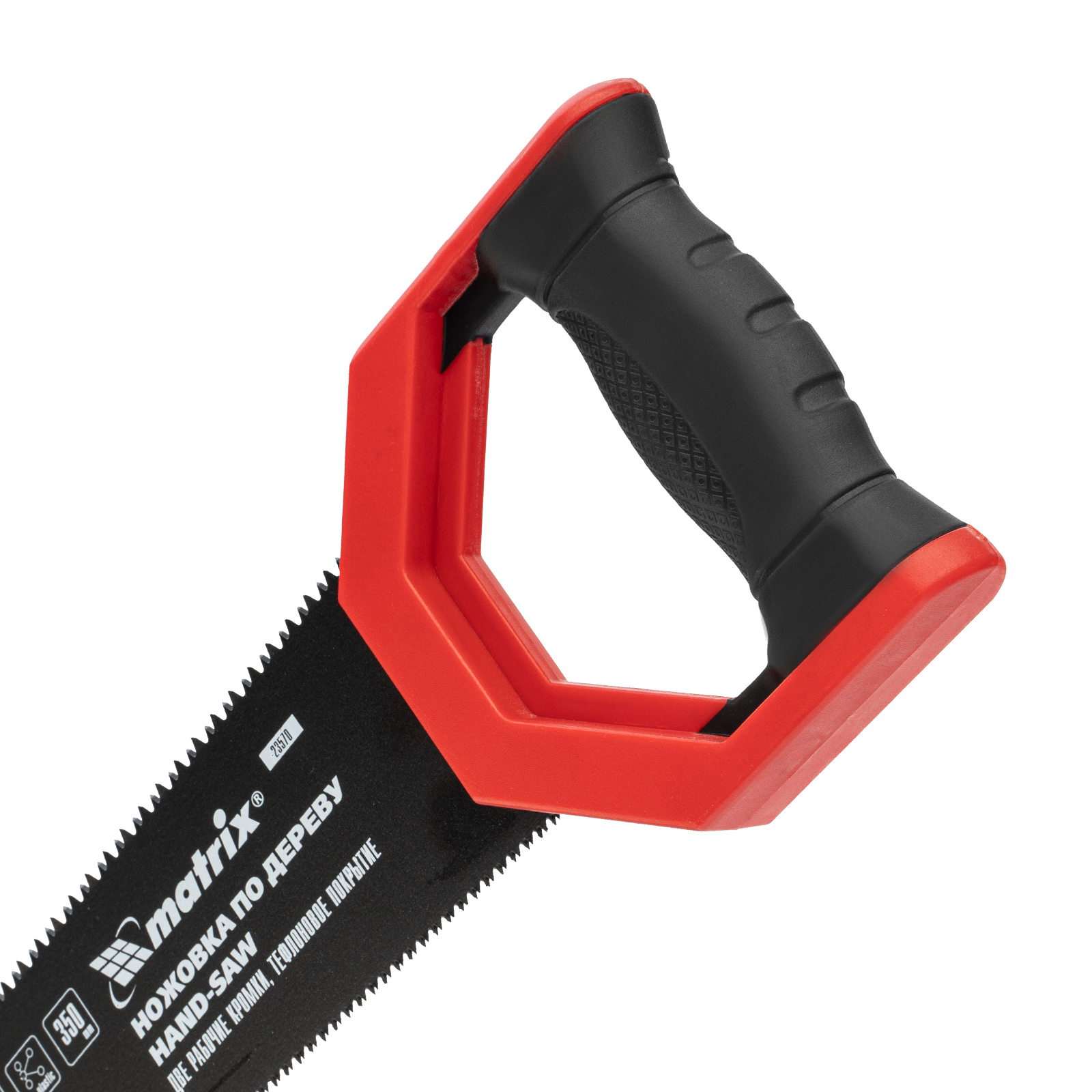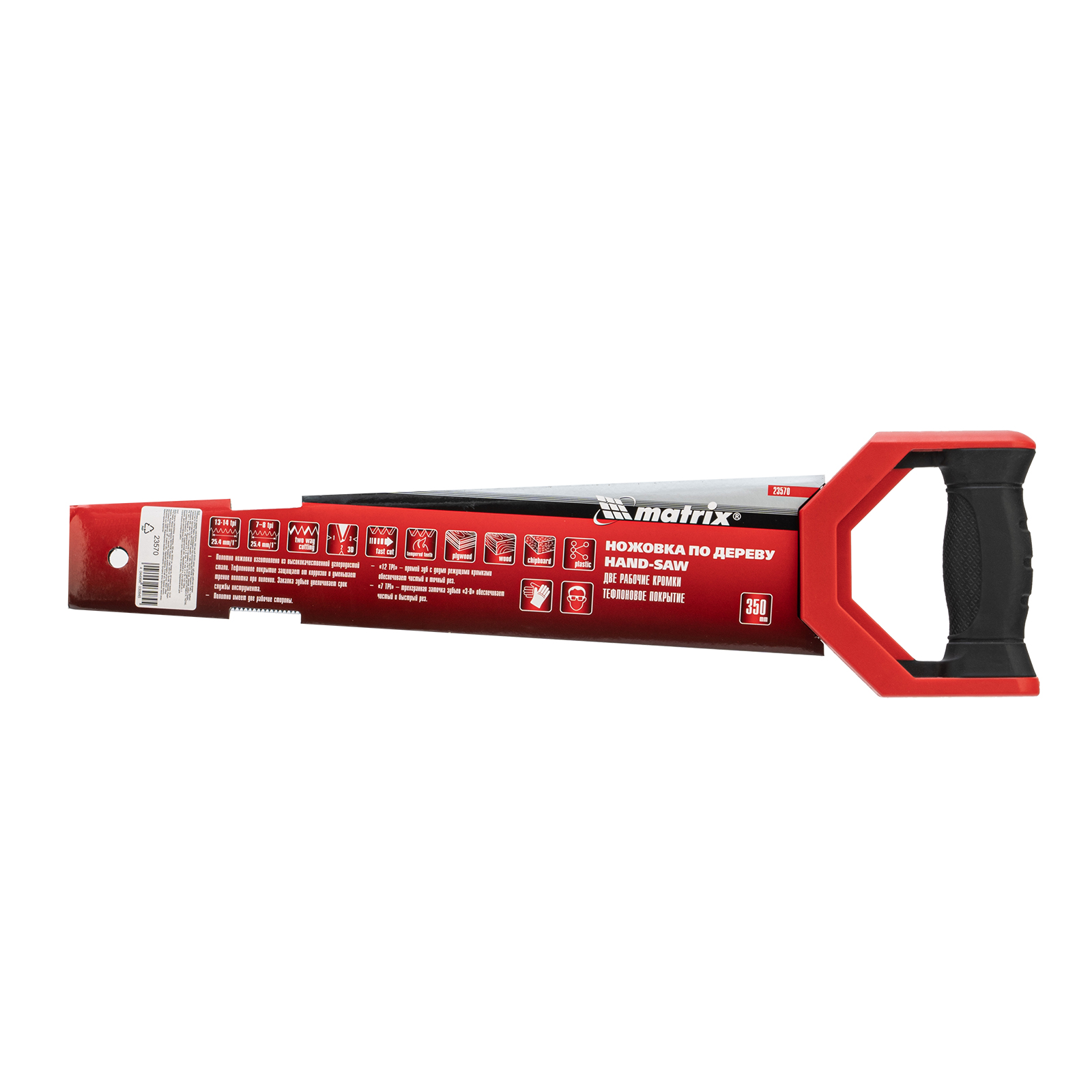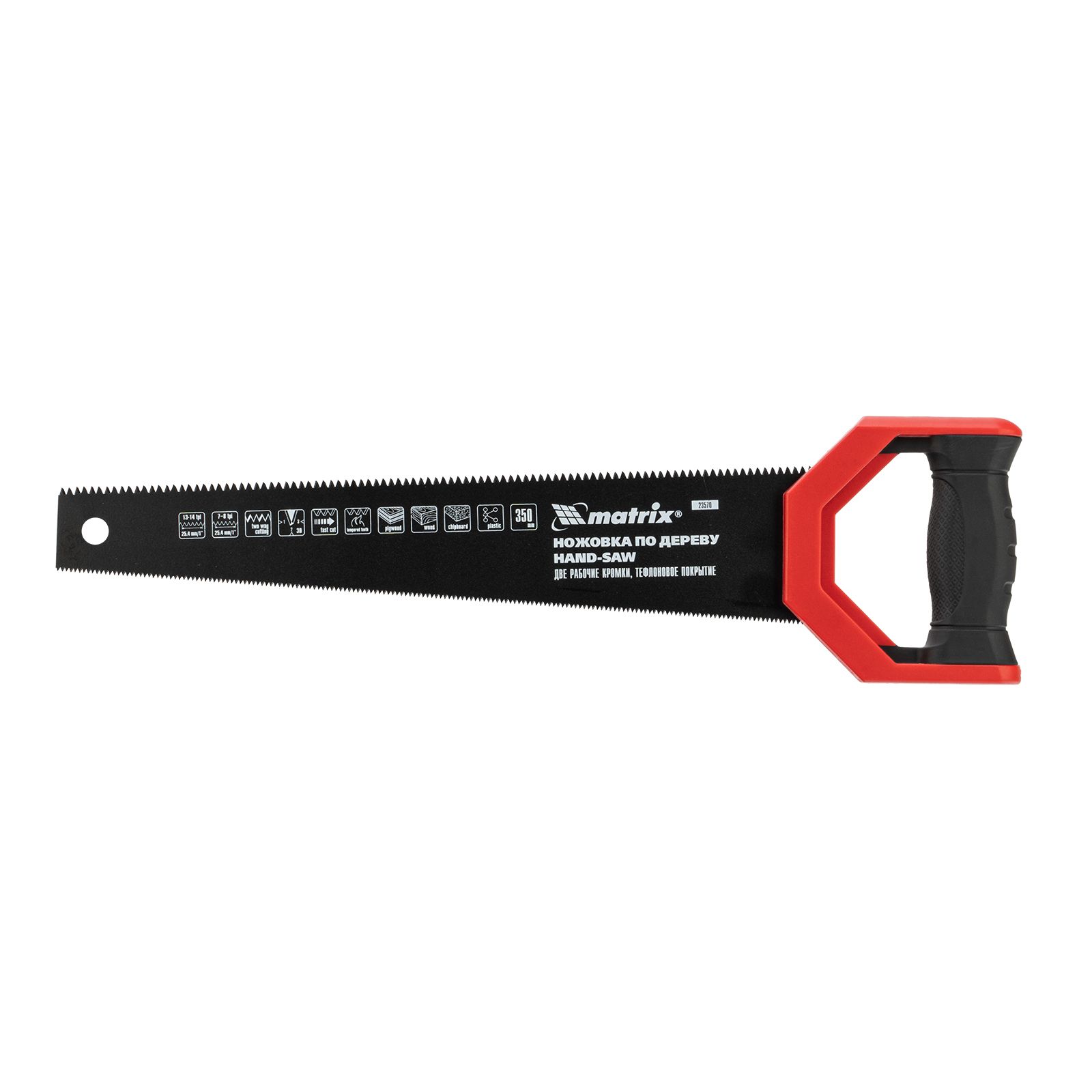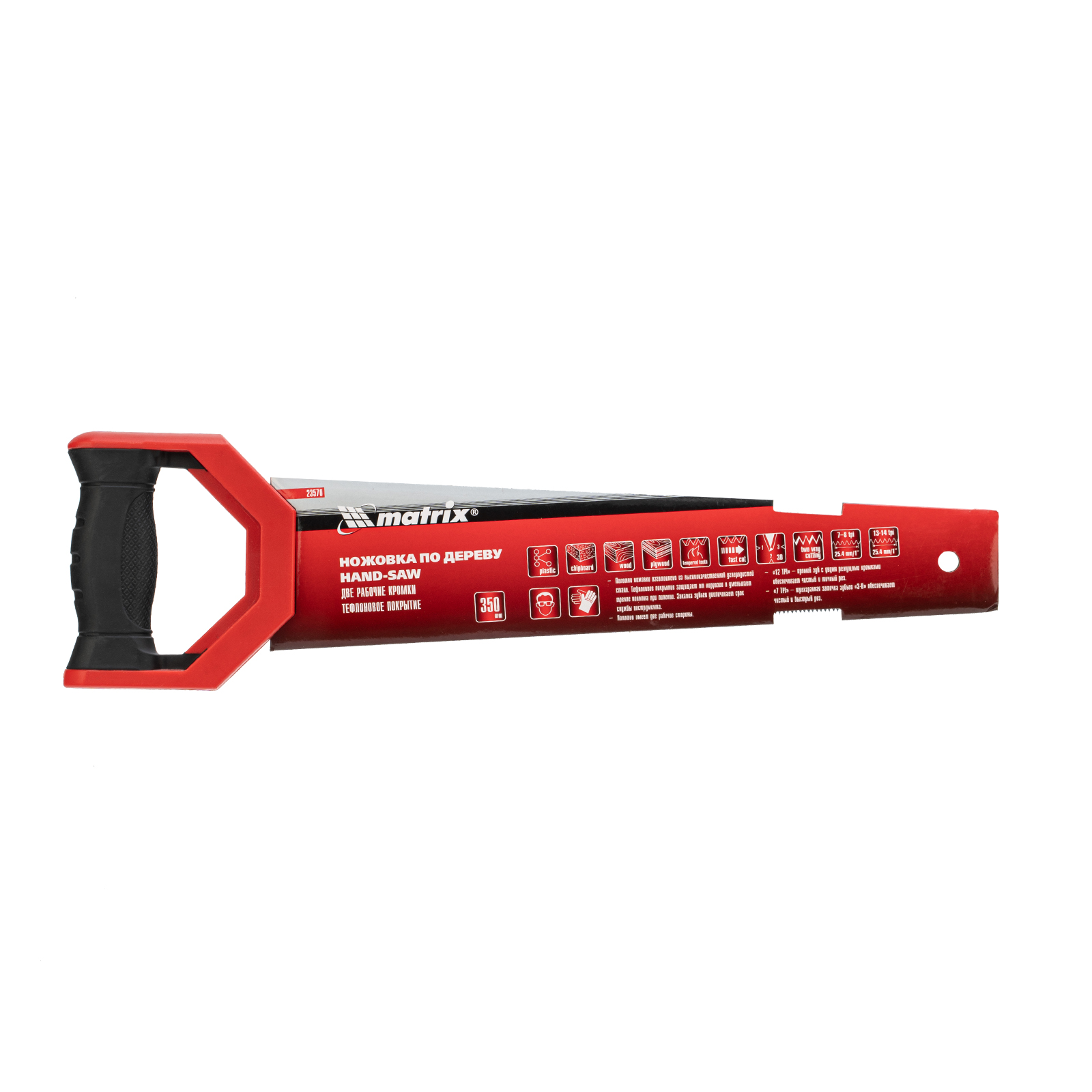 Ножовка по дереву Matrix UNIVERSAL 23570 с полотном длиной 350 мм и закаленными зубьями c заточкой 3D и 2D имеет две рабочие кромки с шагом зубьев 13-14 TPI и 7-8 TPI. Может применяться для выполнения столярных и плотницких работ разной степени точности. Мелкие зубья с 2D-заточкой обеспечивают ровный и точный рез в направлении от себя и к себе. Режущая кромка с шагом зубьев 7-8 TPI и с 3D-заточкой используется для быстрой и чистой распиловки. Ножовкой можно пилить древесину, фанеру, ДСП.