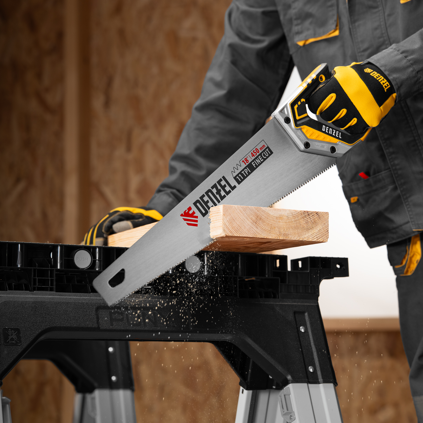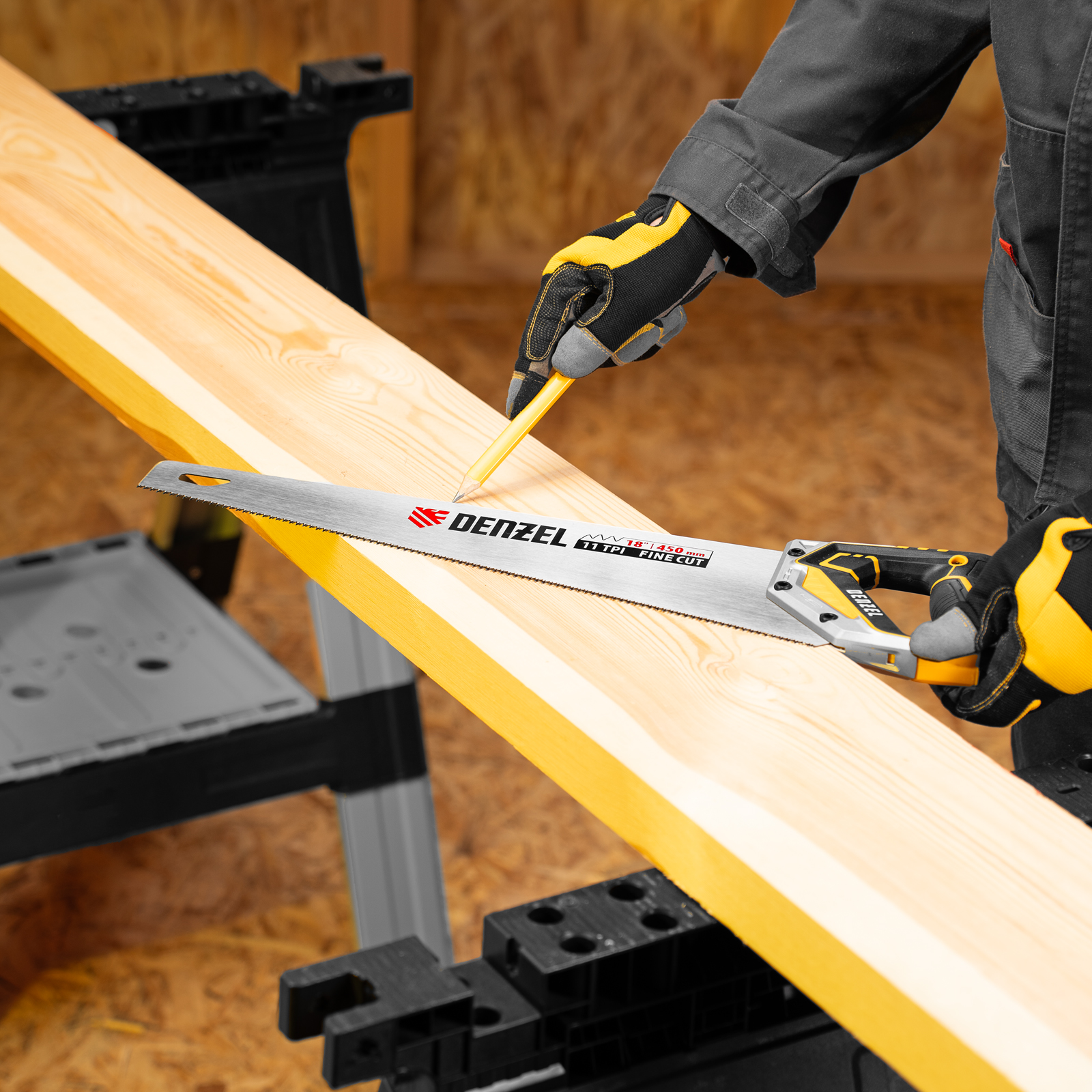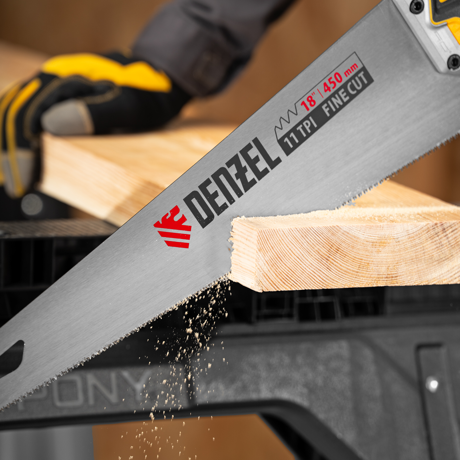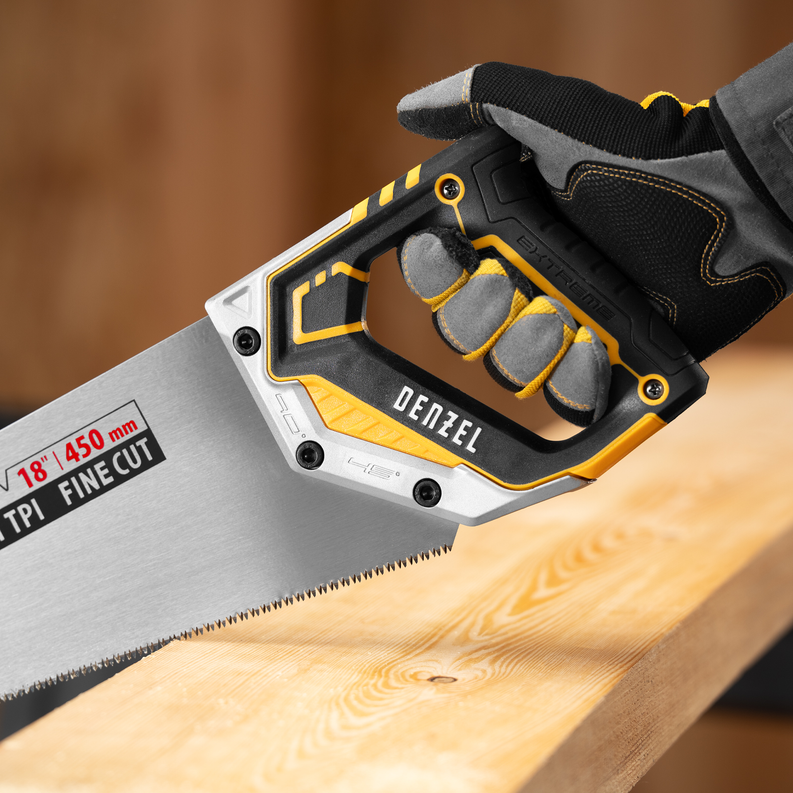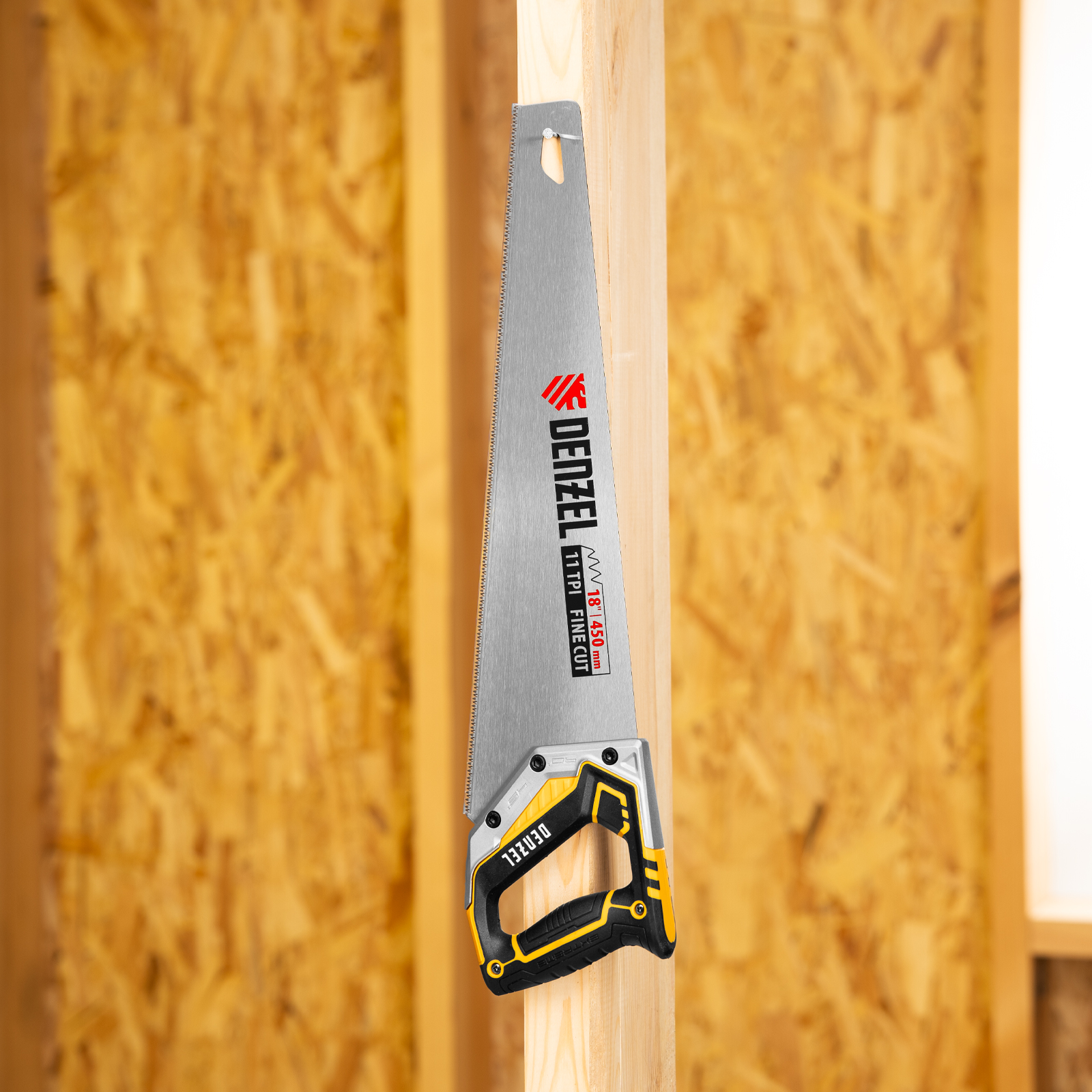 Ножовка по дереву Denzel 24141 длиной 450 мм, с зубьями с шагом 11 TPI и 3D-заточкой, с металлопластиковой рукояткой, предназначена для продольной и поперечной распиловки заготовок из древесины, ДСП, ДВП, МДФ, ламината, а также из ПВХ (труб, панелей, коробов). Подходит для распиливания плинтусов, вагонки, деревянных профиле й. Мелкие зубья с шагом 11 TPI позволяют выполнять точный и чистый рез. Ножовка используется для проведения столярных работ в мастерской и на дачном участке.