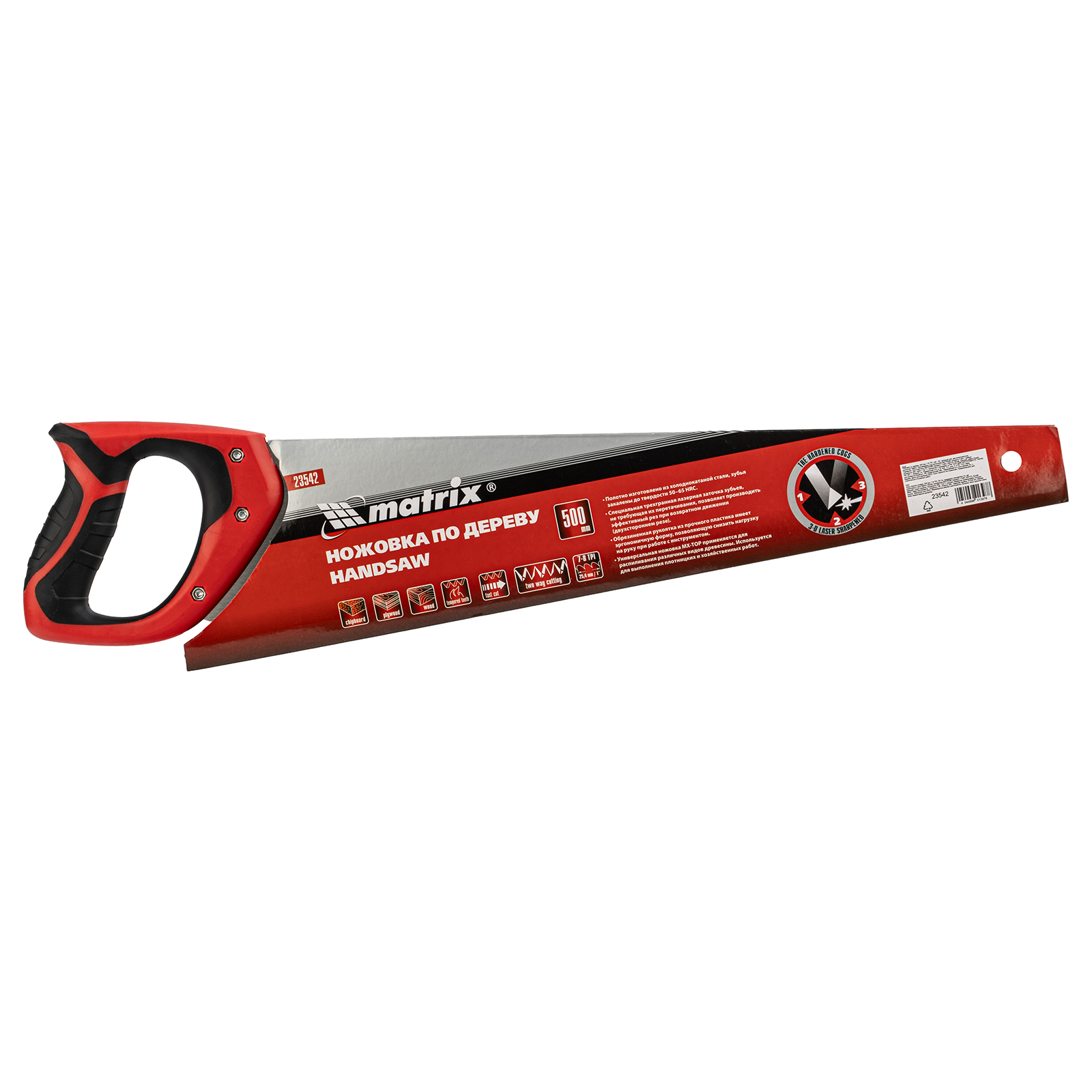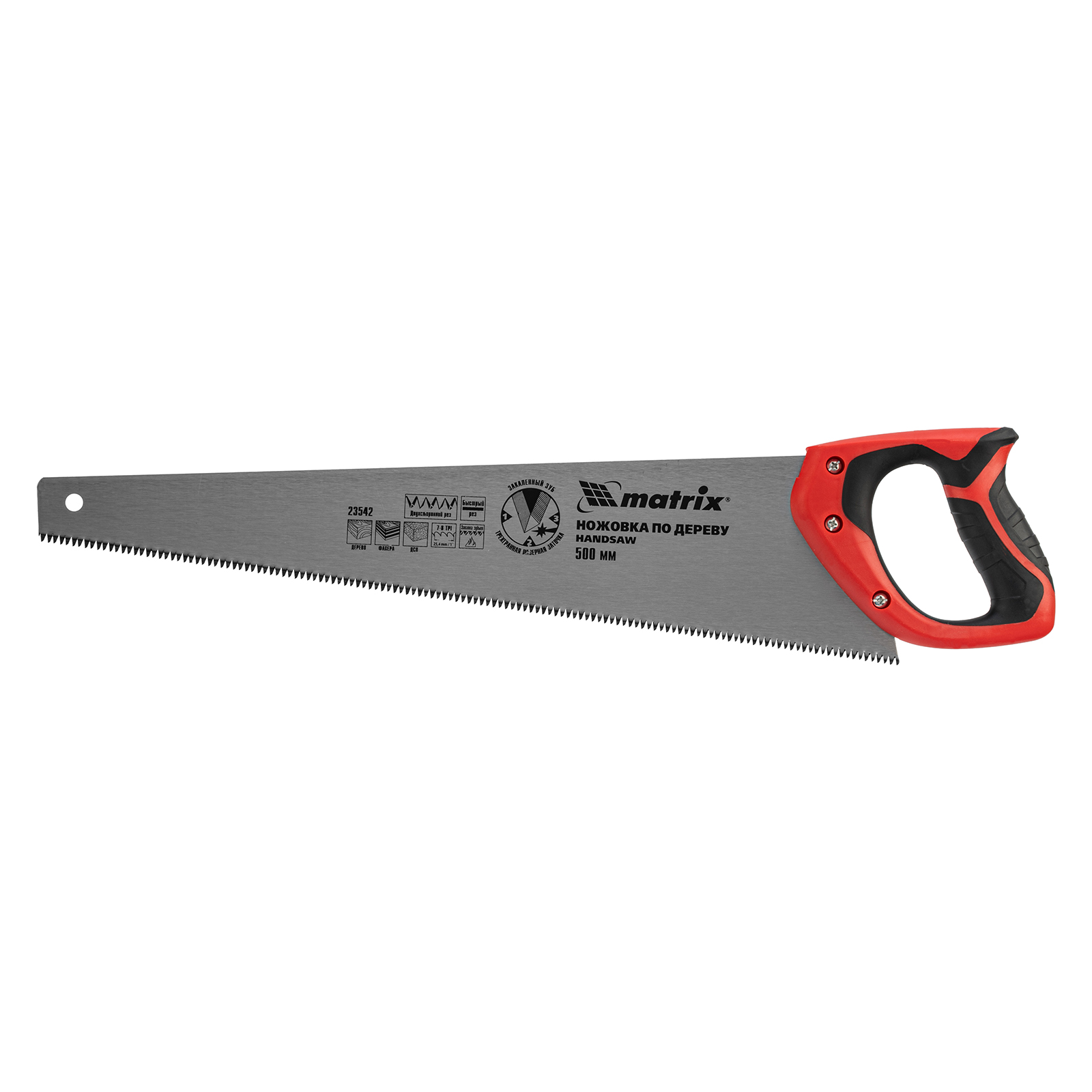 Ножовка по дереву Matrix 23542 с полотном длиной 500 мм, с калеными зубьями с 3D-заточкой и шагом 7-8 TPI, с двухкомпонентной рукояткой, используется для продольного и поперечного пиления досок, брусков, листов фанеры, ДСП. Благодаря трехгранной заточке зубьев пила характеризуется высокой производительностью. Шаг зубьев составляет 7-8 TPI, что обеспечивает быстрый и качественный рез. Ножовка пригодится в столярной мастерской, а также будет полезна в хозяйстве.
