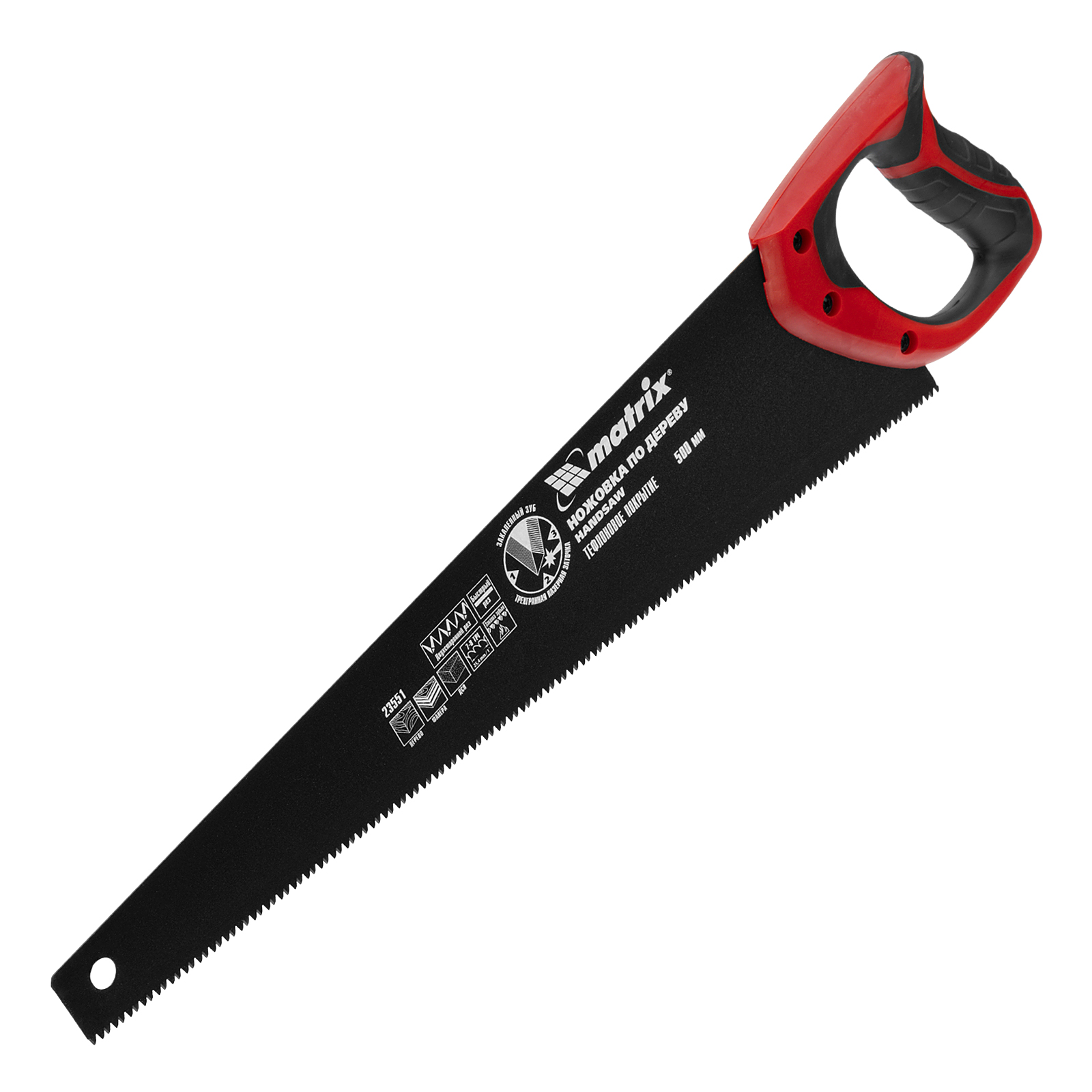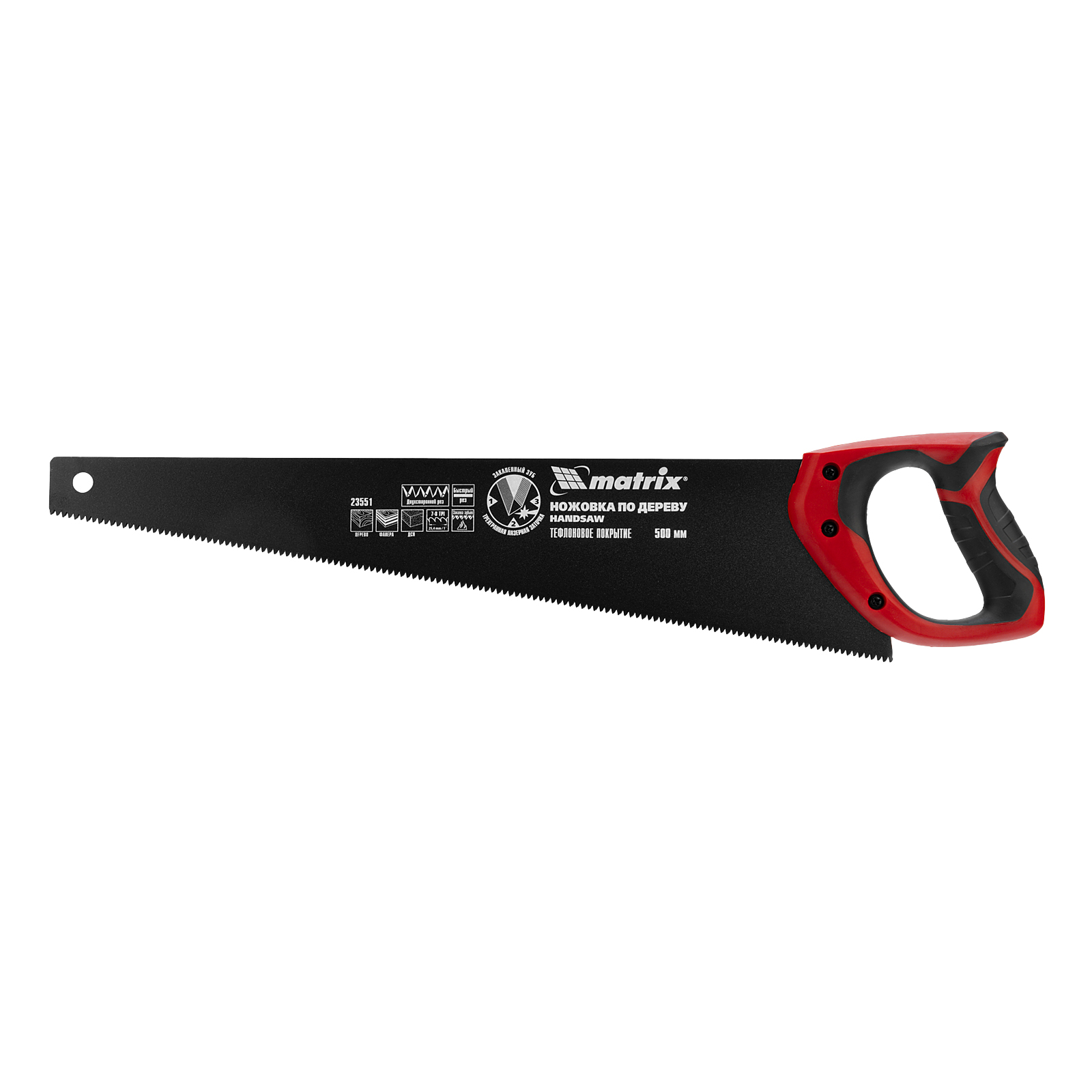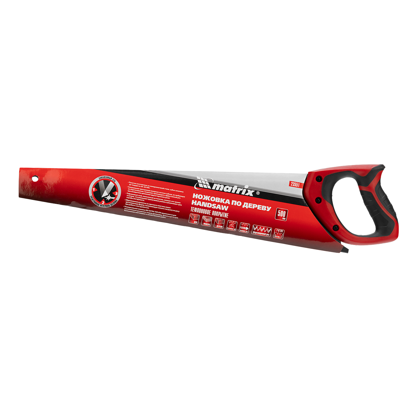 Ножовка по дереву Matrix 23551 с полотном длиной 500 мм, с калеными зубьями с шагом 7-8 TPI и 3D-заточкой, с тефлоновым покрытием полотна и 2-компонентной рукояткой, пилит древесину, фанеру и ДСП. Подходит для продольного и поперечного пиления, используется для быстрой распиловки заготовок. Трехгранная заточка зубьев обеспечивает инструменту повышенную производительность. Ножовка будет полезна столяру, плотнику, а также пригодится в домашнем хозяйстве.