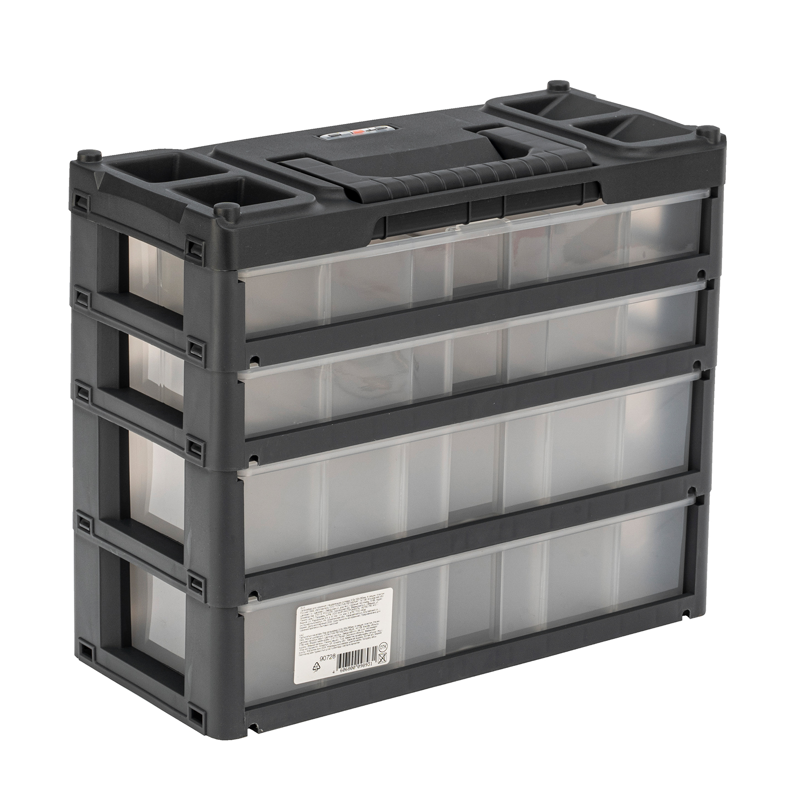 Органайзер Stels 90728 размером 310 х 150 х 260 мм, из пластика, имеет 4 секции с выдвижными лотками и используется для хранения крепежных элементов, принадлежностей для рукоделия, снастей и т.д. Обеспечивает быстрый доступ к предметам, позволяет избежать их перемешивания и утери. Пригодится в гараже, мастерской, будет полезен в домашнем хозяйстве.