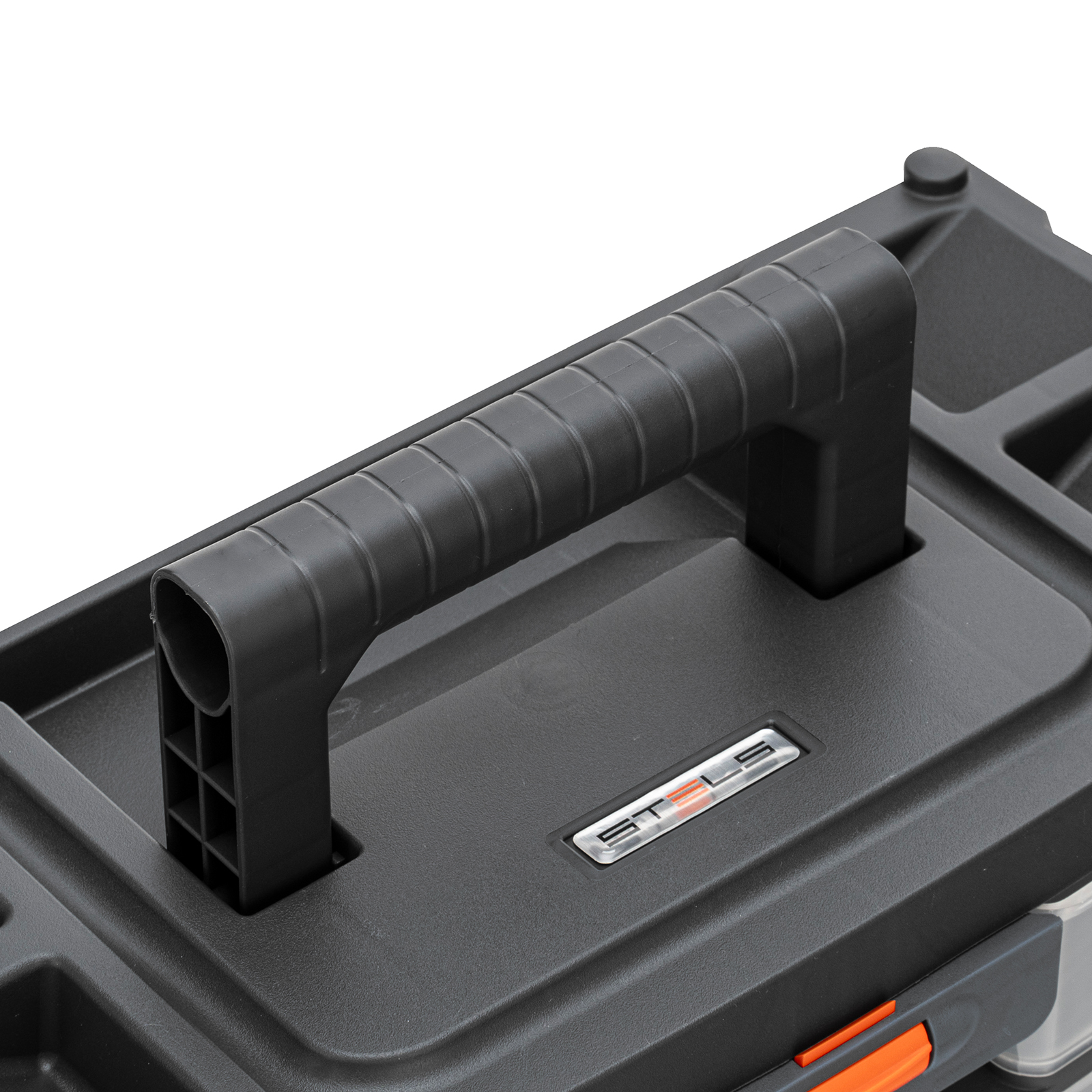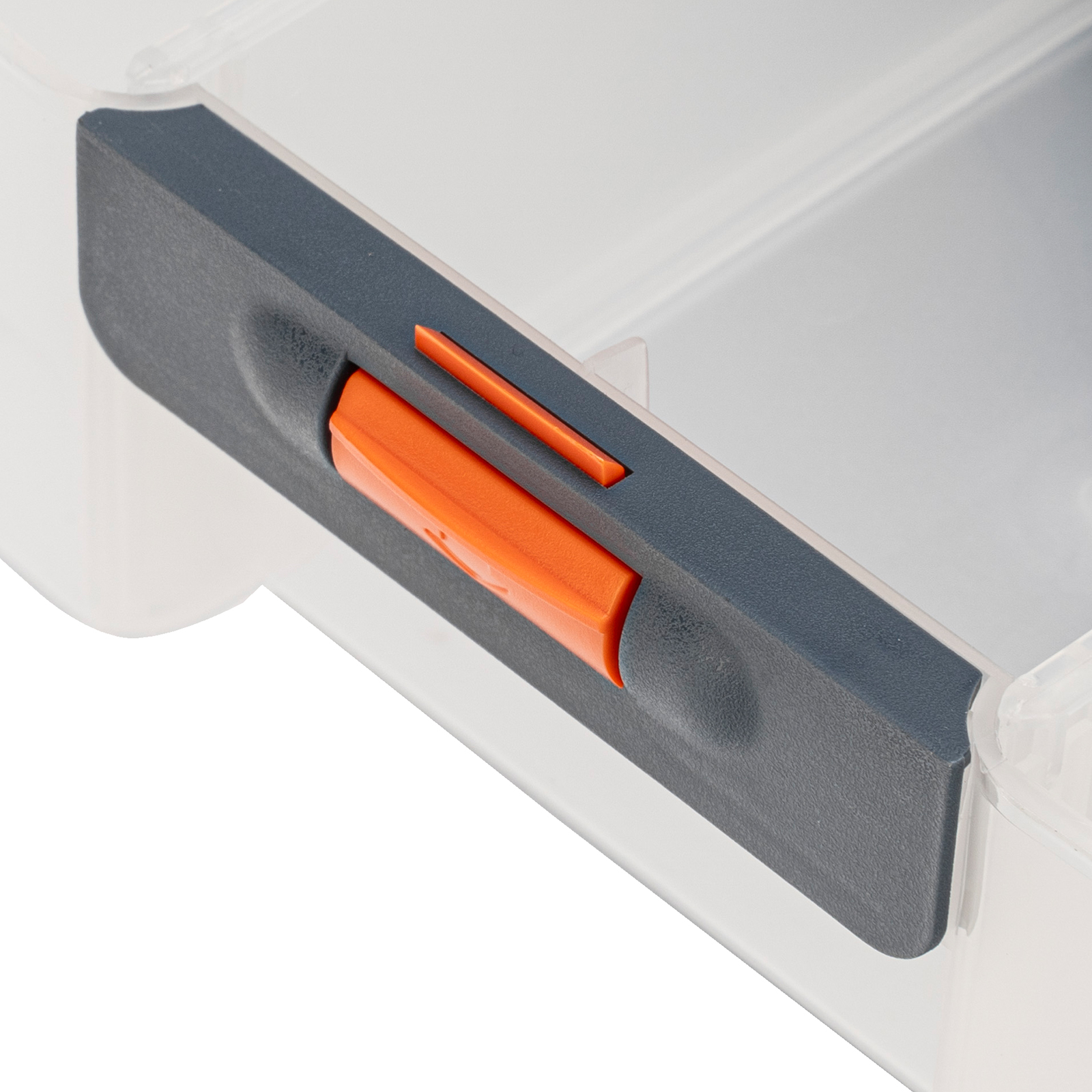 - Комфортная транспортировка — благодаря рукоятке и защелкам, предотвращающим случайное открытие, органайзер удобно перемещать.