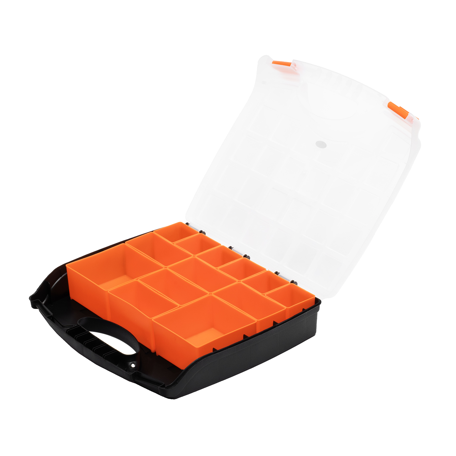 - Защелки и ручка обеспечивают удобство транспортировки органайзера.