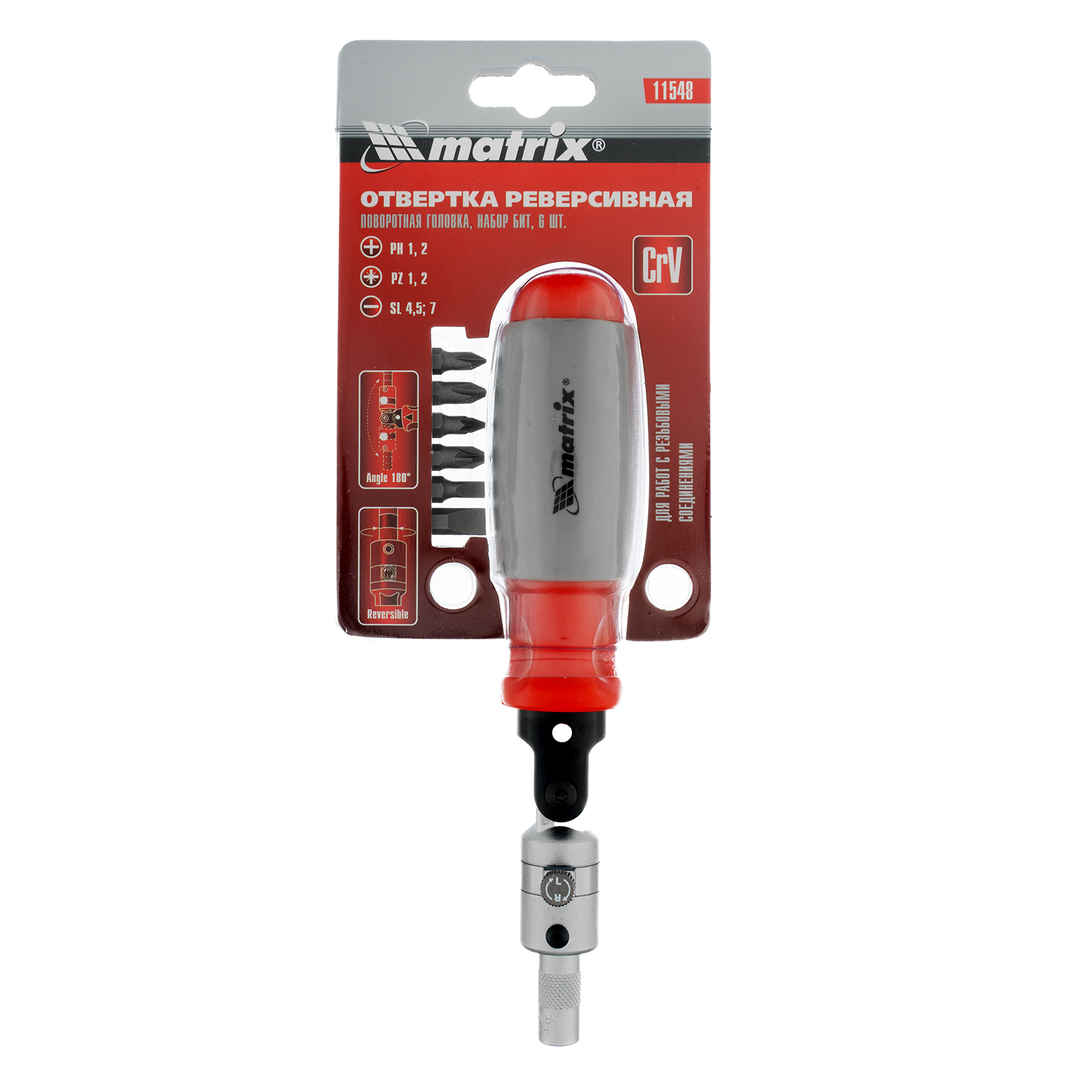 Реверсивная отвертка Matrix 11548 с поворотной головкой, с набором бит из стали CrV, 6 шт. в упаковке, используется для закручивания и откручивания резьбовых соединений и является отличной альтернативой набору отверток. Храповой механизм избавляет от необходимости перехватывать ручку по время работы. Переключатель реверса позволяет вращать рабочую часть как по часовой стрелке, так и против нее. В комплекте имеются насадки со шлицами PH, PZ и SL. Набор рекомендован для профессионального применения.