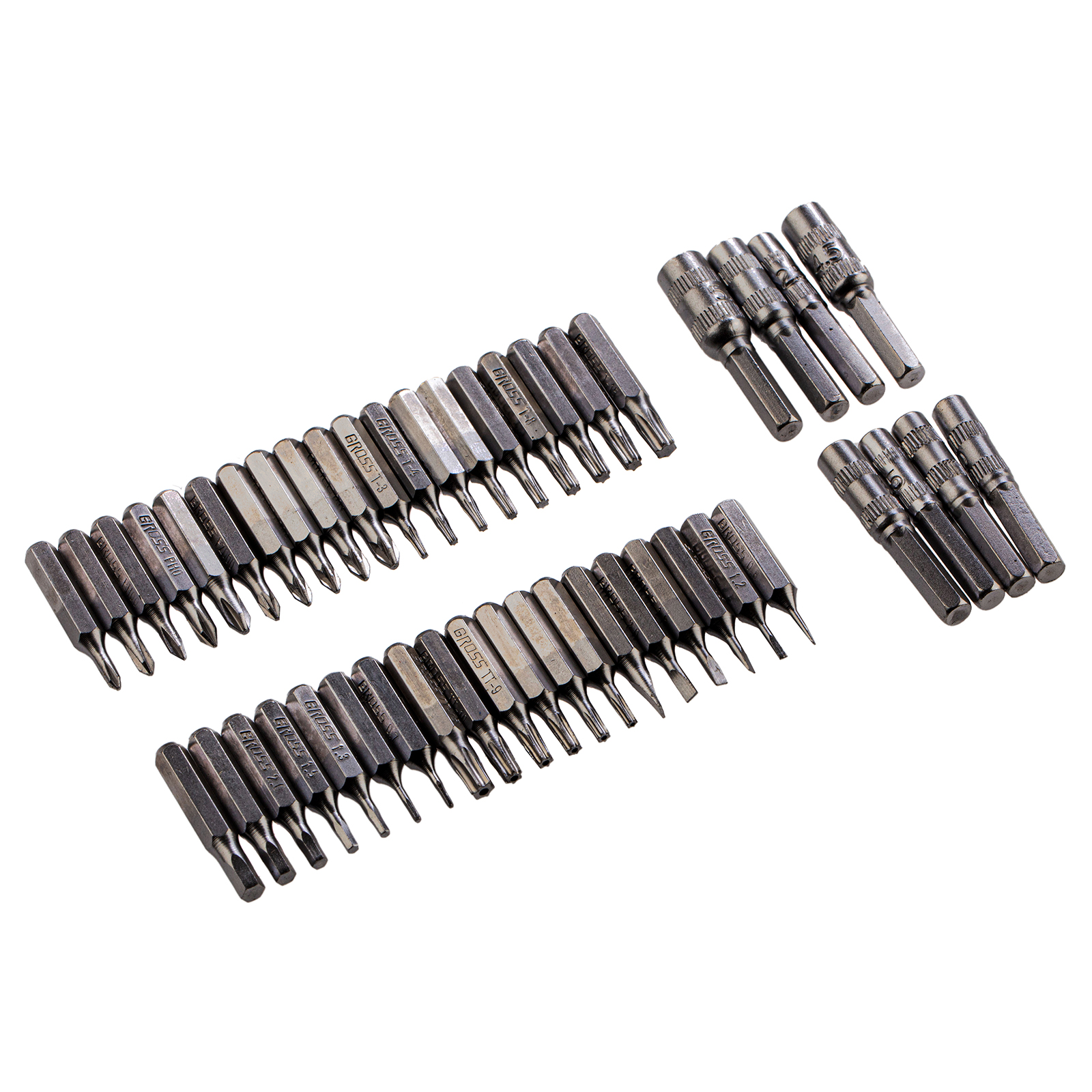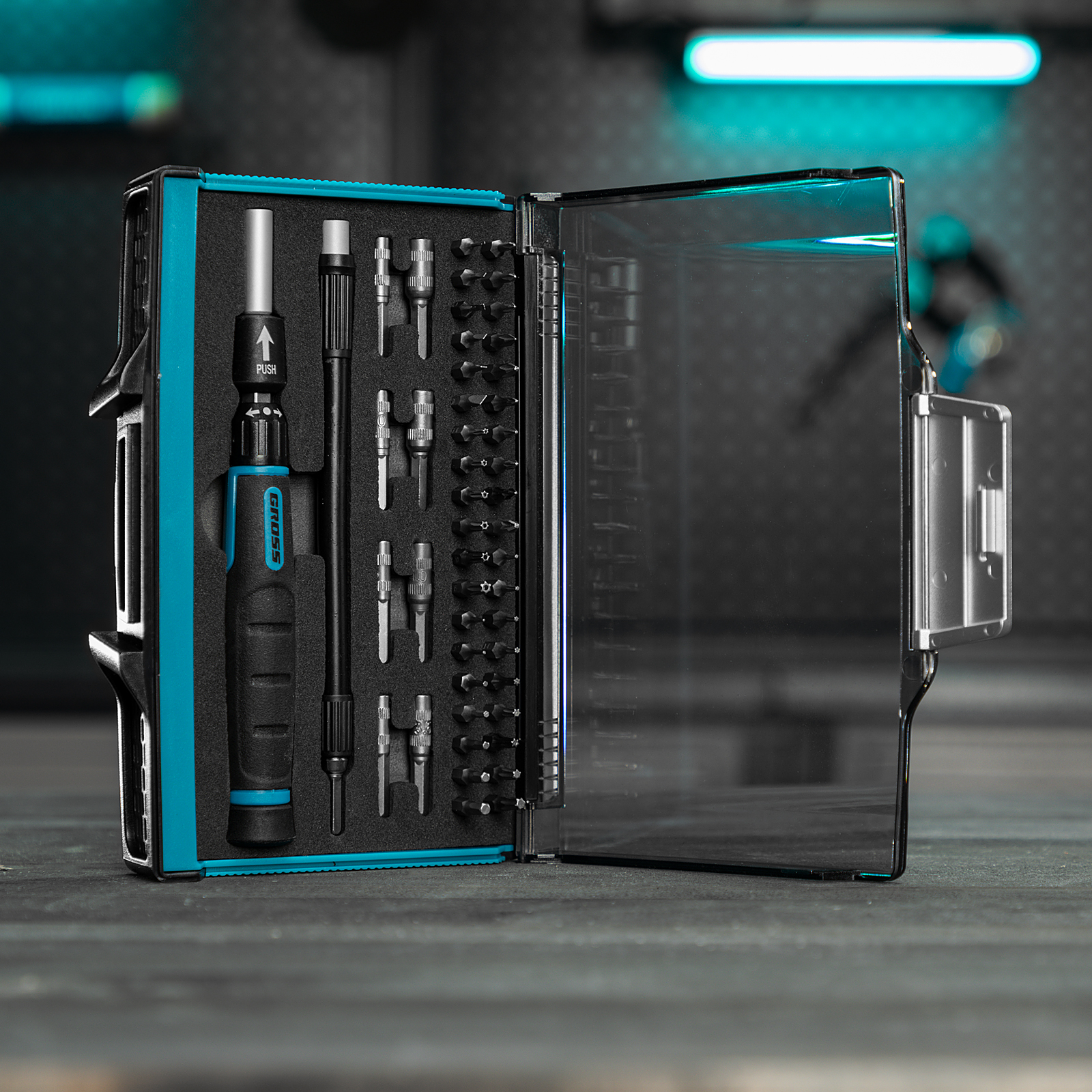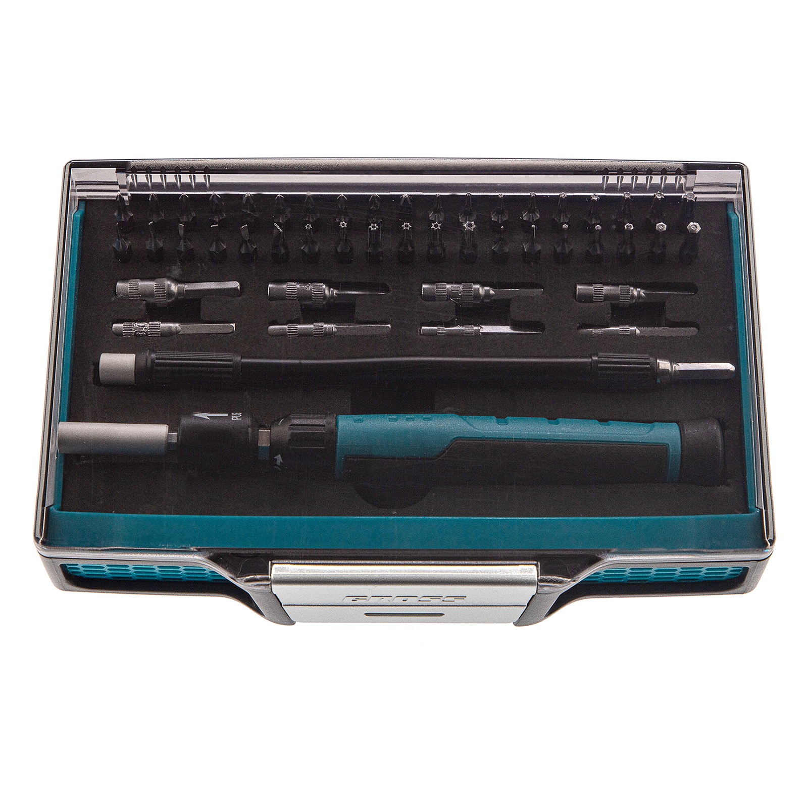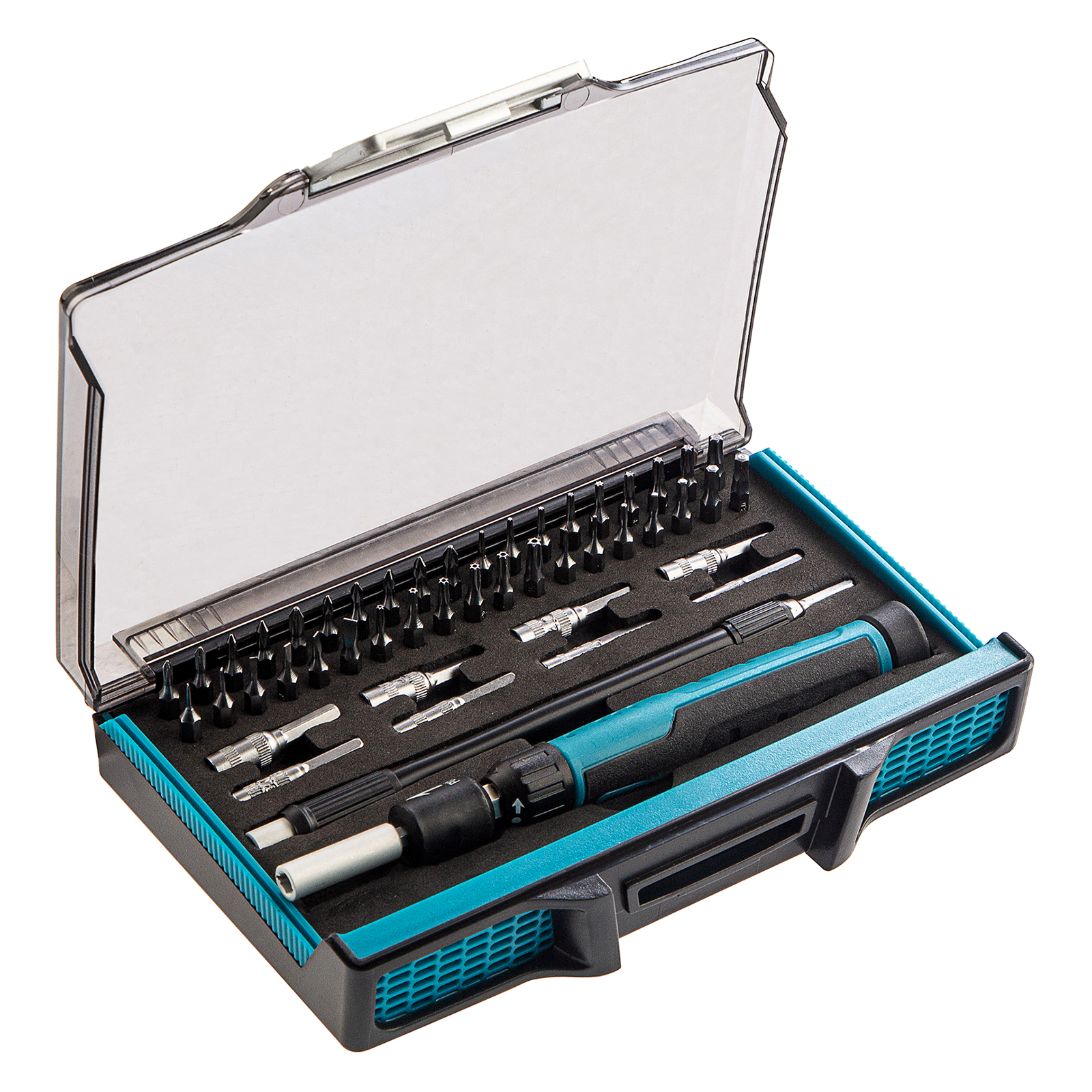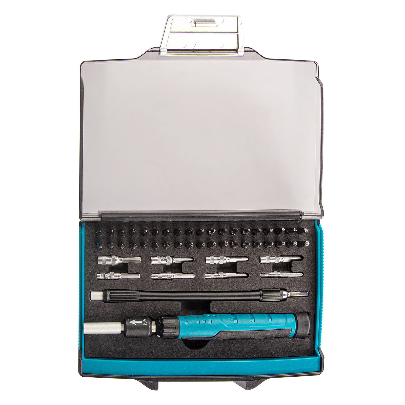 Пластиковый кейс - 1 штБиты для точных работ PH: 000, 00, 00, 0, 1 - 5 штБиты для точных работ PZ: 000, 00, 00, 0, 1 - 5 штБиты для точных работ SL: 0.8, 1.2, 1.5, 1.8, 2.0, 3.0 - 5 штБиты для точных работ Hex: 0.7, 0.9, 1.3, 1.5, 2.0, 2.5, 3.0 - 7 штБиты для точных работ Torx: T3, T4, T5, T6, T7, T8, T9, T10, TT6, TT7, TT8, TT9, TT10, TT15 - 14 штТорцевые головки: 2.5, 2.5, 3.0, 3.0, 3.5, 4.0, 4.5, 5.0 мм - 8 штТелескопическая реверсивная отвертка для точных работ - 1 штГибкий удлинитель 4 мм x 150 мм - 1 шт |