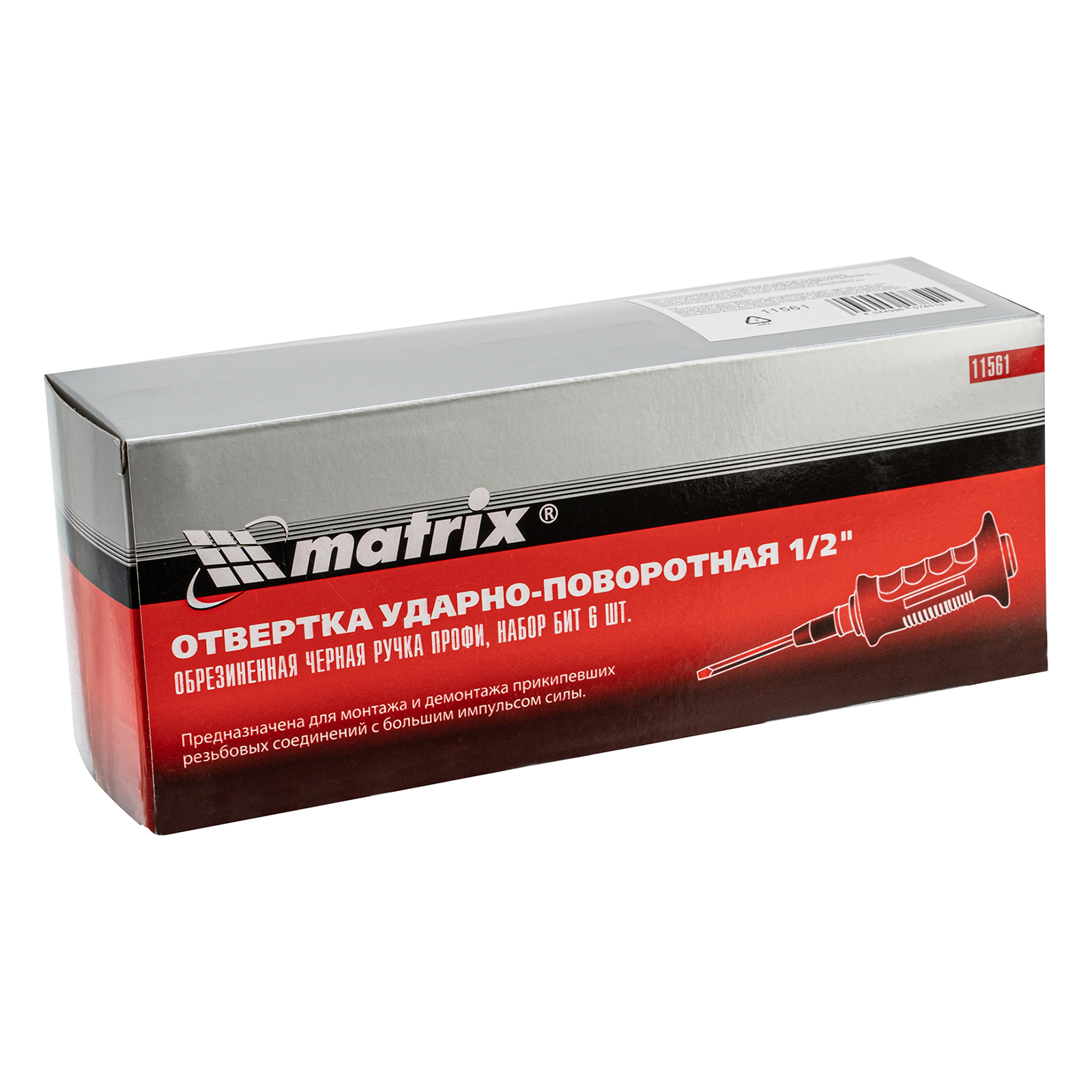 Ударно-поворотная отвертка Matrix 11561 с черной ручкой, с присоединительным шестигранником 1/2", с набором из 6 бит., в пластиковом кейсе, предназначена для работы с резьбовыми соединениями, в том числе для демонтажа перетянутых или заржавевших крепежей. Металлический затыльник выдерживает удары молотком. Отвертка используется при проведении ремонта автомобильной и другой техники, рекомендована для профессионального применения.