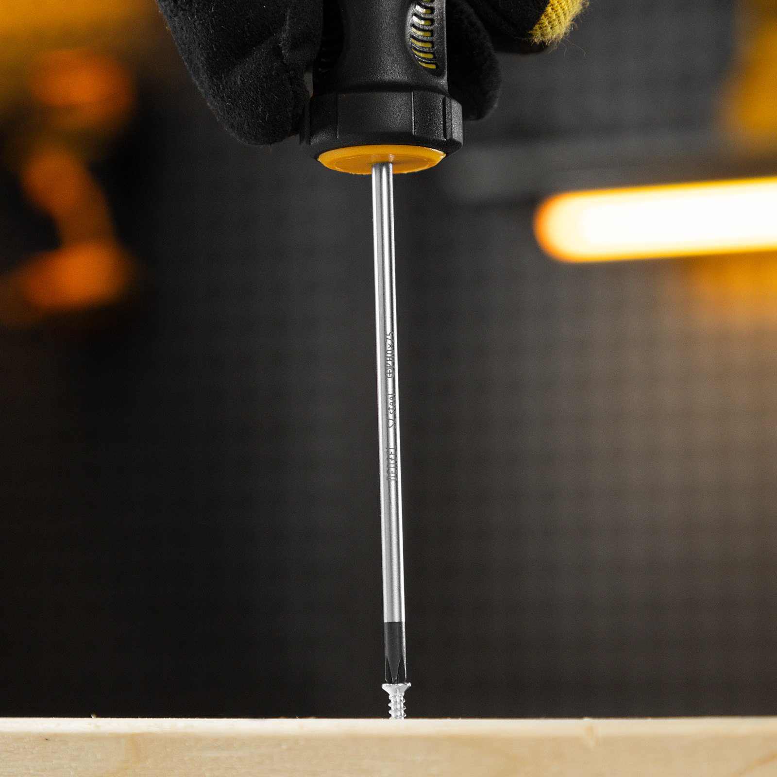 - Удобное хранение — отверстие в рукоятке позволяет подвешивать отвертку на крючок или скобу.