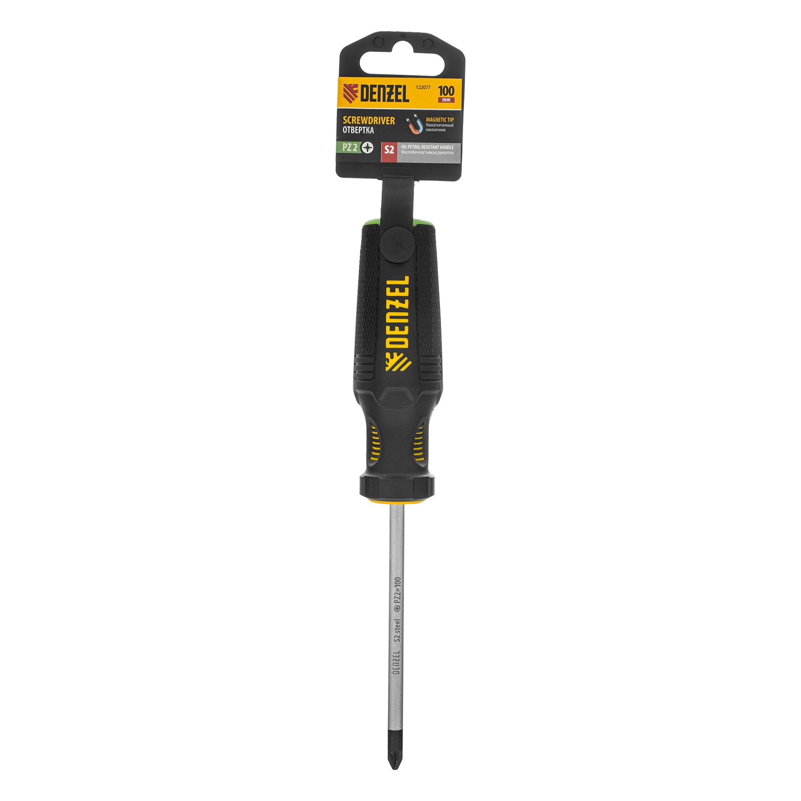 Отвертка Denzel 122077 с трехкомпонентной рукояткой, со стержнем из стали S2, длиной 100 мм, имеет шлиц PZ2 и предназначена для монтажных и демонтажных работ с резьбовыми соединениями типа Pozidriv. Благодаря намагниченному высокоточному шлицу отвертку с крепежом можно направлять одной рукой, удерживая другой закрепляемую деталь. Инструмент подходит для профессионального использования.