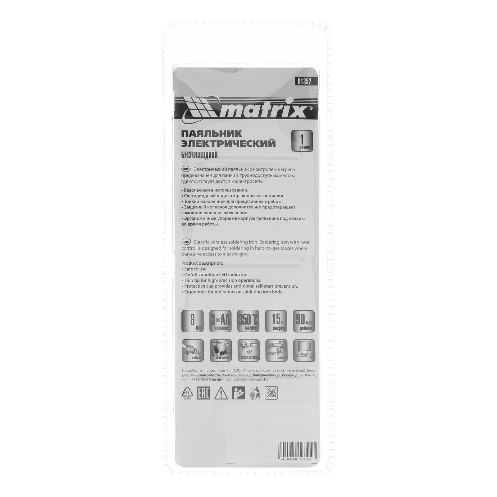 Беспроводной паяльник Matrix 91352 с рабочим напряжением 4,5 В, мощностью 8 Вт, с припоем 10 г, работает от 3 элементов питания AA, рабочая температура составляет 350 °C. Предназначен для пайки микросхем и проводов в условиях отсутствия розетки 220 В. Приобретать припой не нужно — он входит в комплект поставки. Прибор устойчив к повреждениям, т.к. нагревательным элементом в нем является нихромовая спираль. Будет полезен на выездной работе или в путешествии.