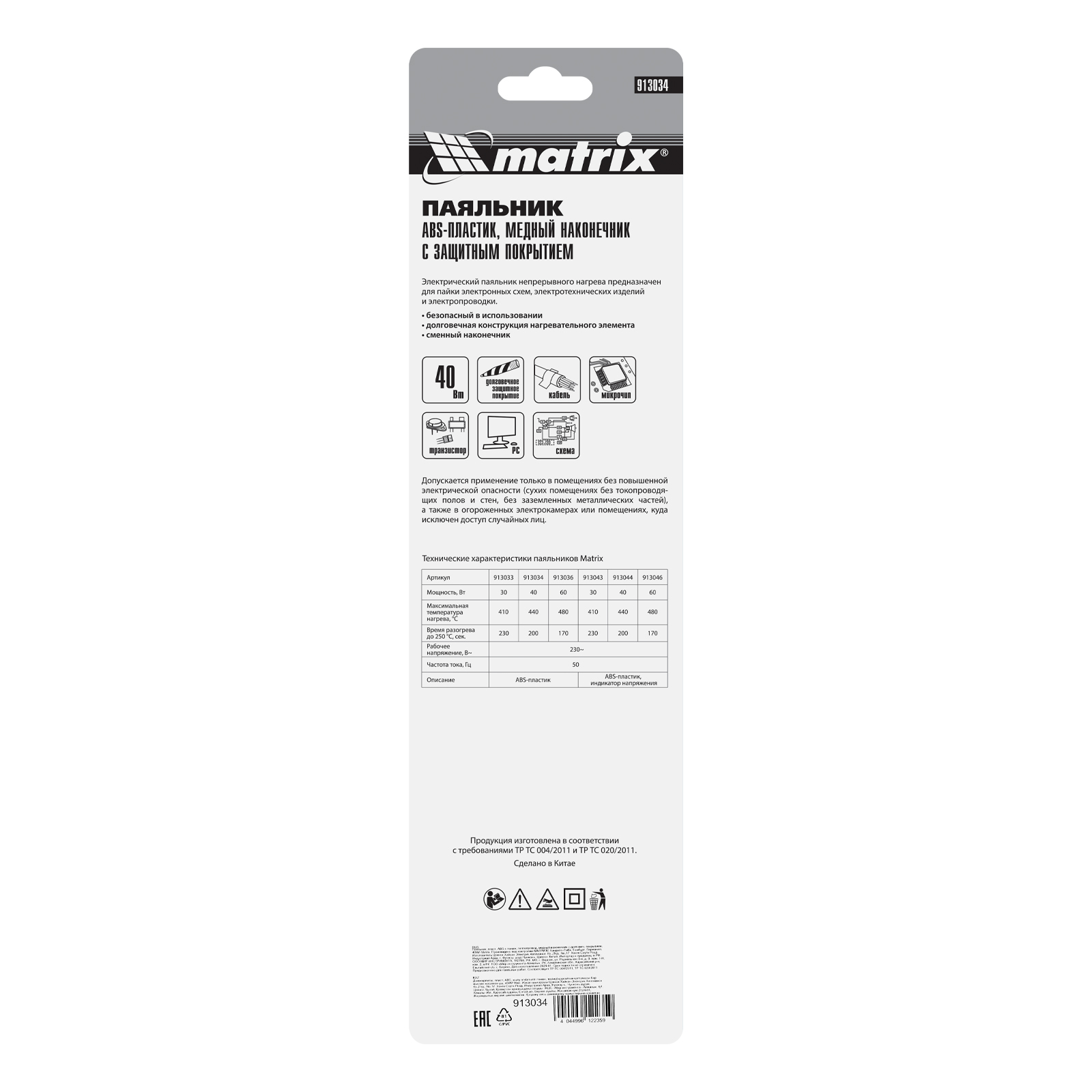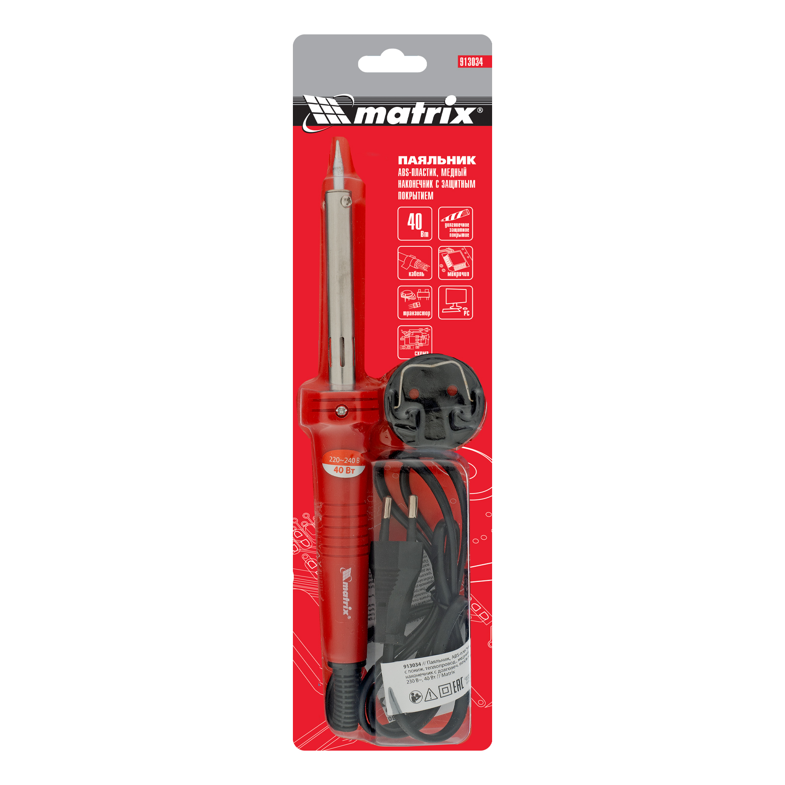 Паяльник, пластик ABS с пониженной теплопроводностью, медный наконечник с долговечным покрытием, 220 В, 40 W Matrix в Екатеринбурге