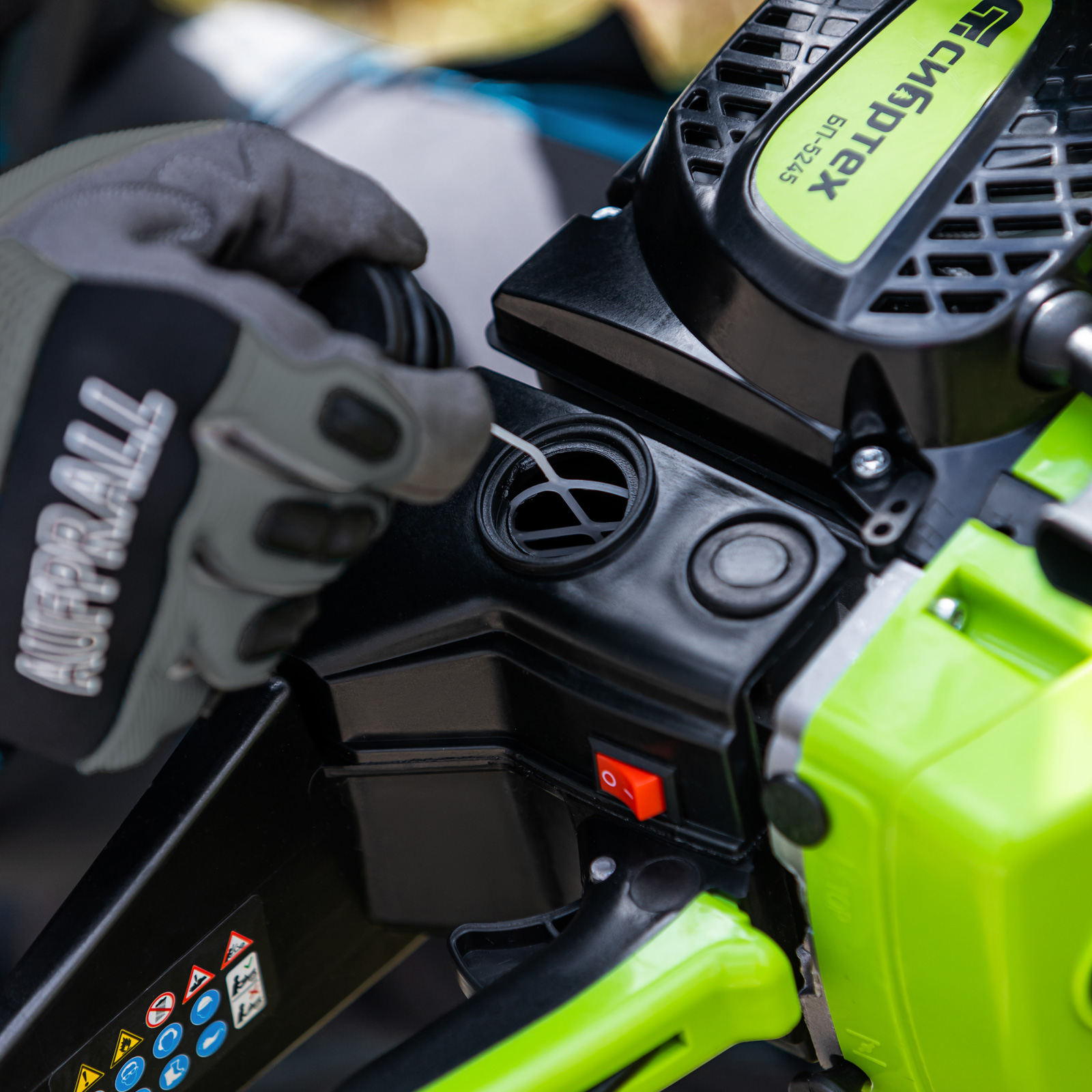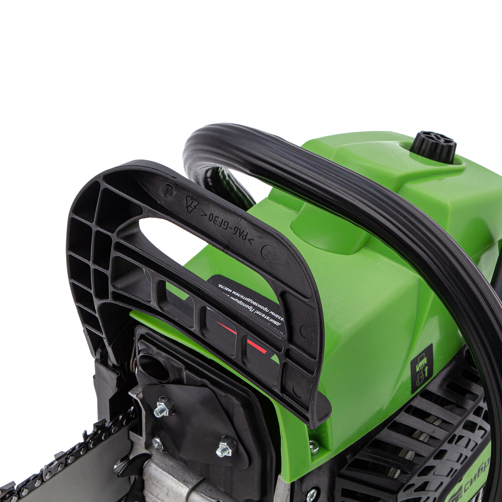 - Безопасность — пила оснащена блокировкой от случайного запуска и тормозом цепи, который моментально срабатывает при отскоке инструмента.