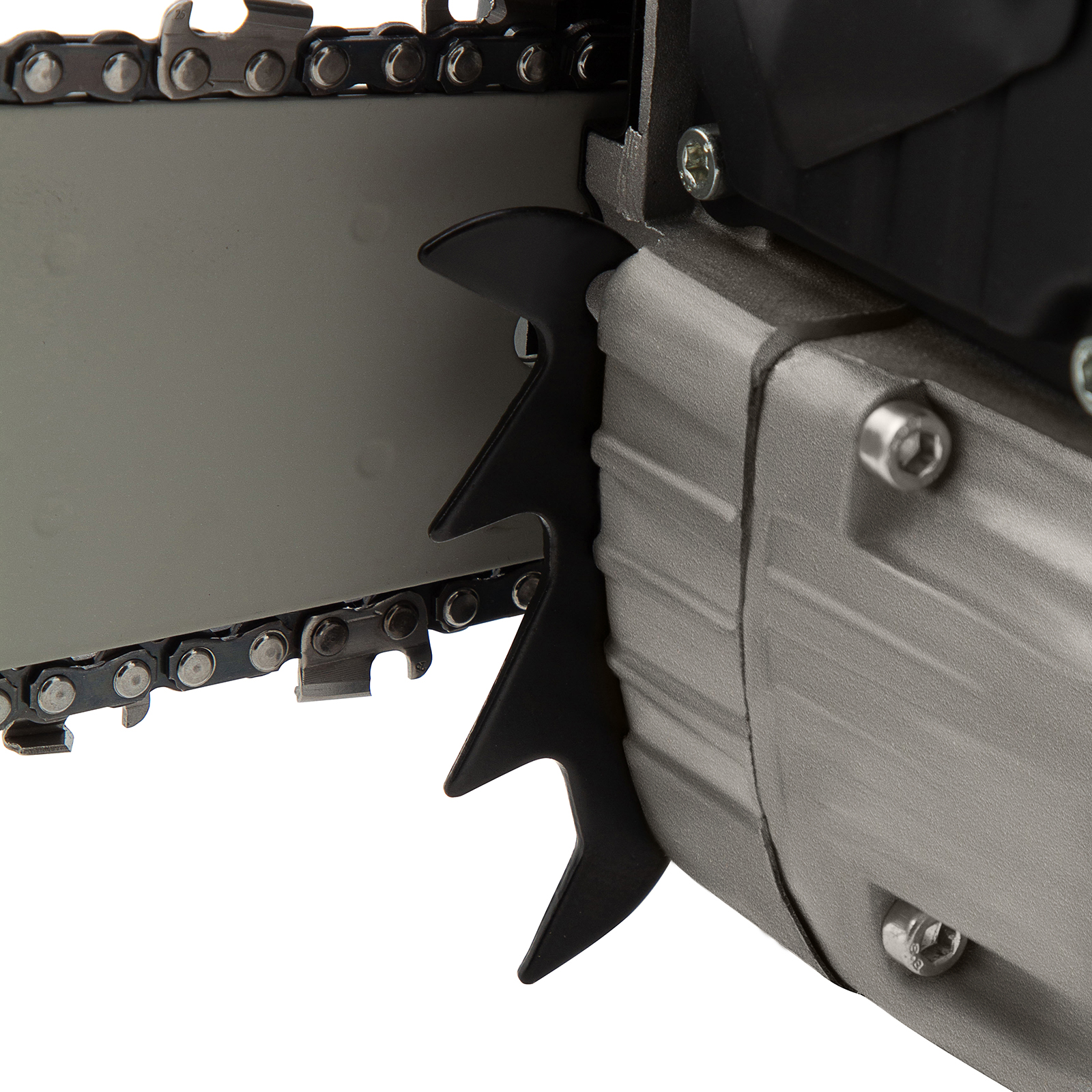 - Стальной зубчатый упор — пилу можно зафиксировать во время работы, это обеспечивает более точный распил и одновременно снижает отдачу.
