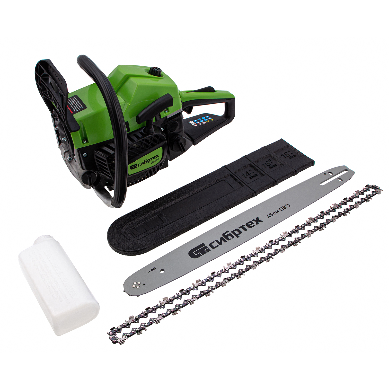 Пила цепная бензиновая - 1 штШина - 1 штЧехол шины - 1 штЦепь - 1 штЕмкость для приготовления смеси - 1 штКомплект инструментов - 1 штРуководство по эксплуатации и гарантийный талон - 1 шт |