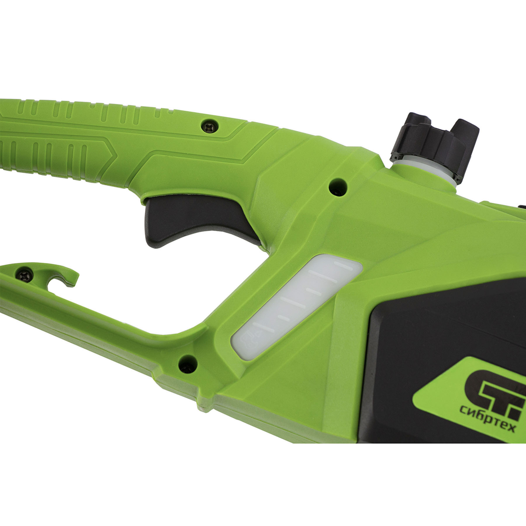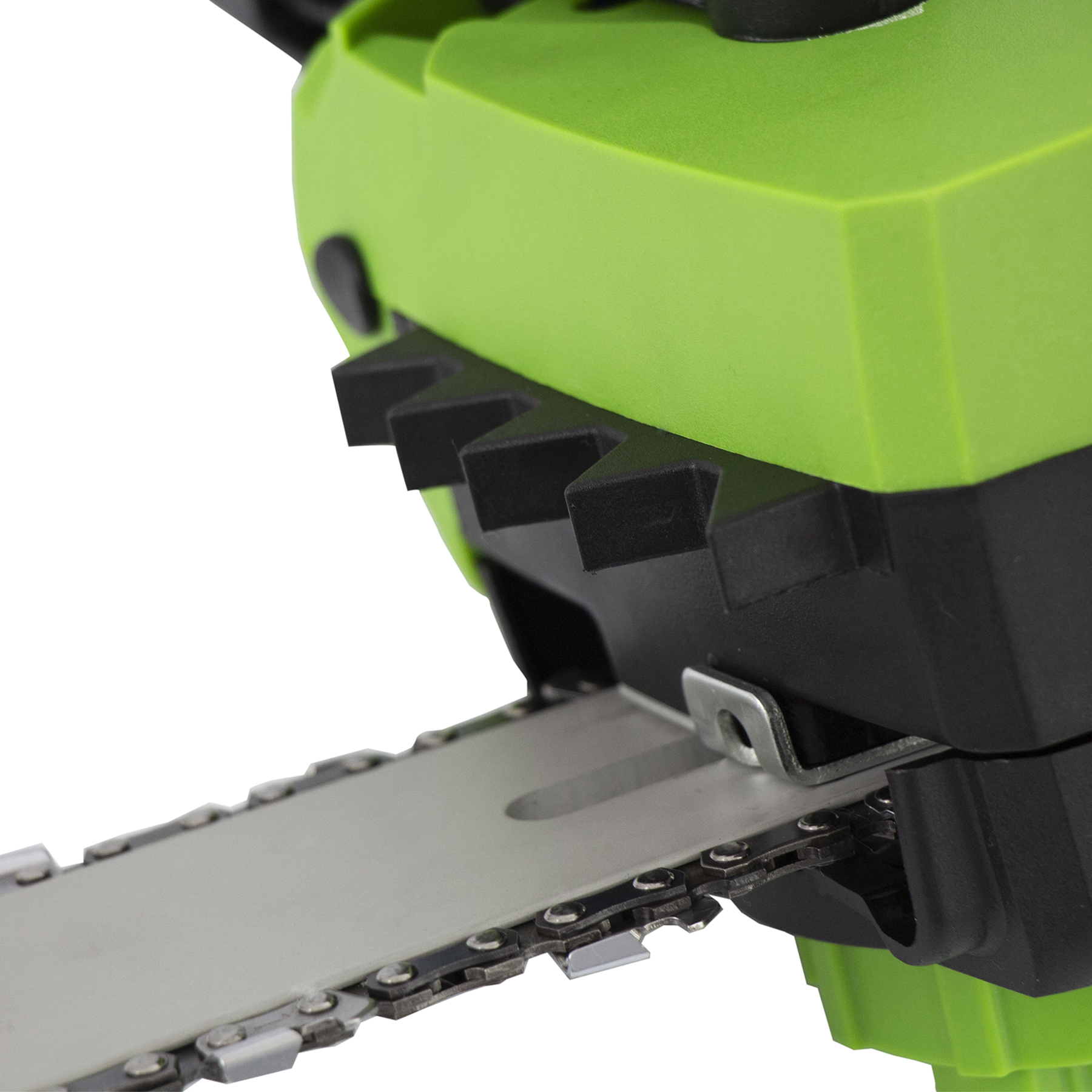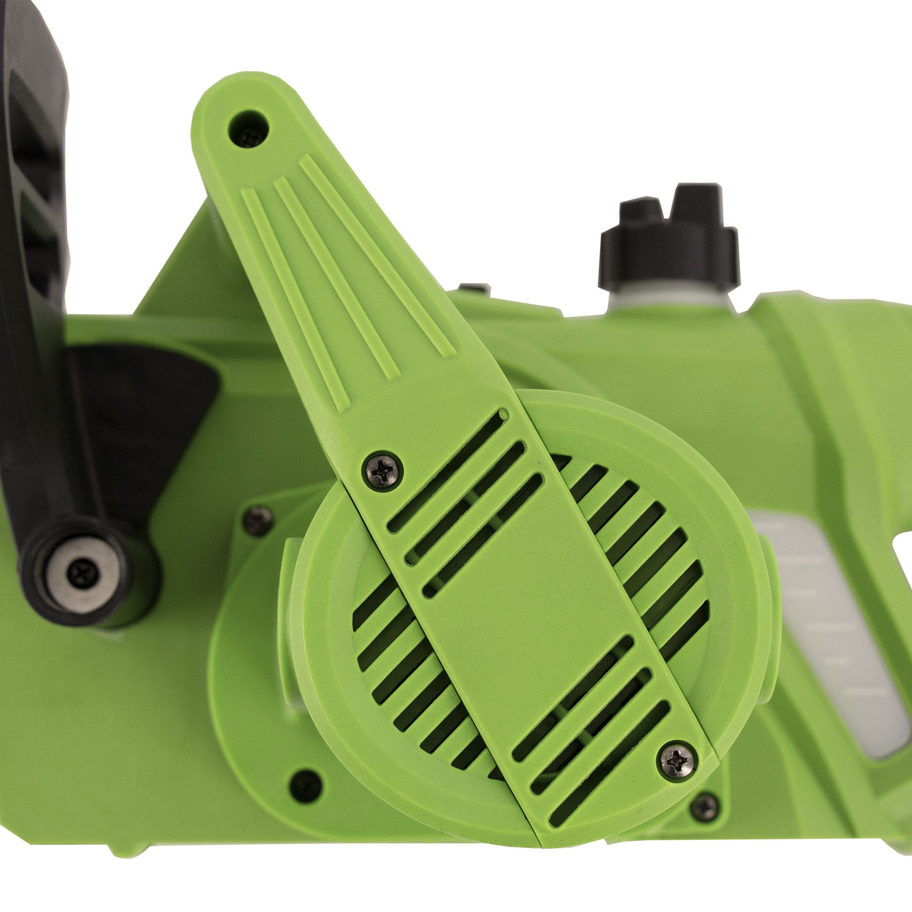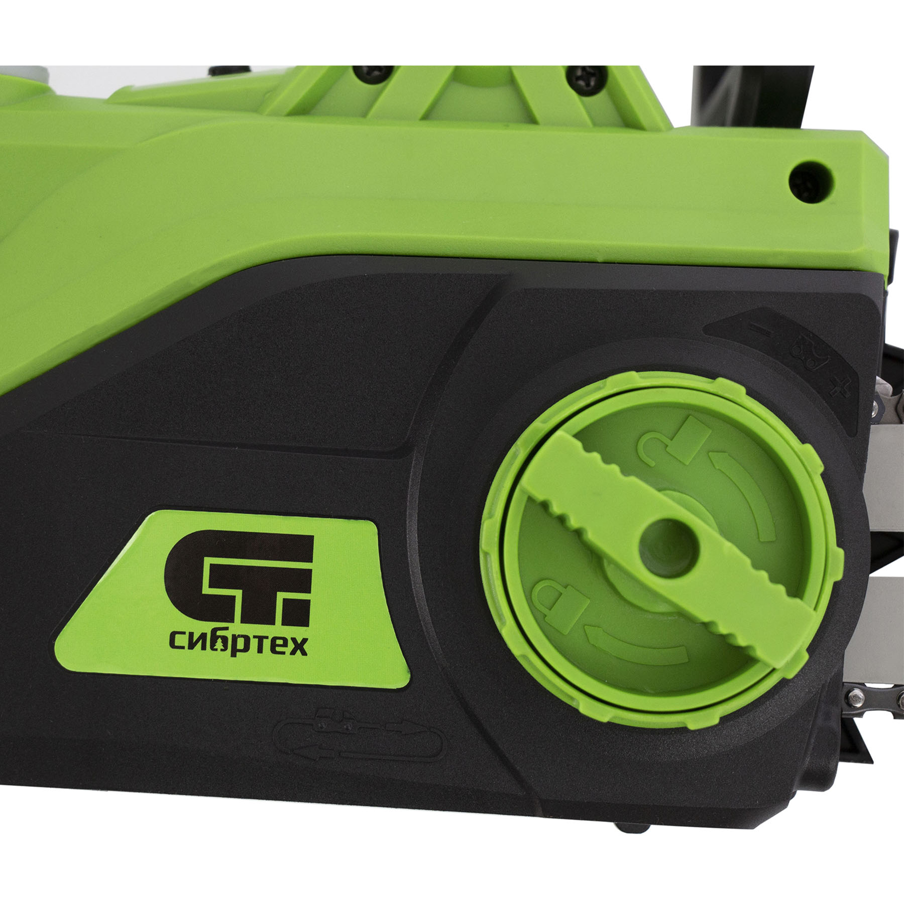 - Бесключевое натяжение цепи — регулировка осуществляется вручную при помощи винта на боковой части корпуса, использование инструментов не требуется.