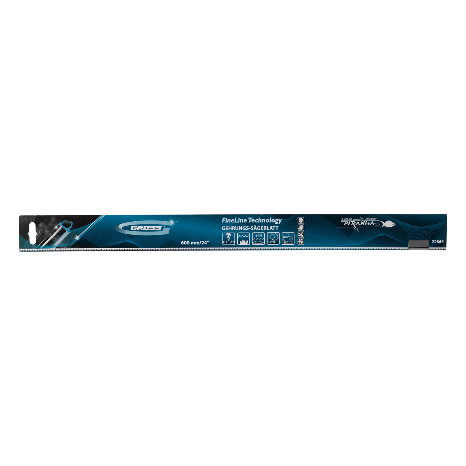 Пильное полотно Gross «PIRANHA» 22869 длиной 600 мм, с каленым зубом с 2D-заточкой, 18 TPI — режущий элемент для прецизионного стусла, применяемый для распила под углом заготовок из дерева, мягкого металла и пластика. Мелкие зубья с шагом 18 TPI позволяют получить точный и чистый рез. Полотно используется для пиления плинтусов, реек, дверных наличников и других деталей.